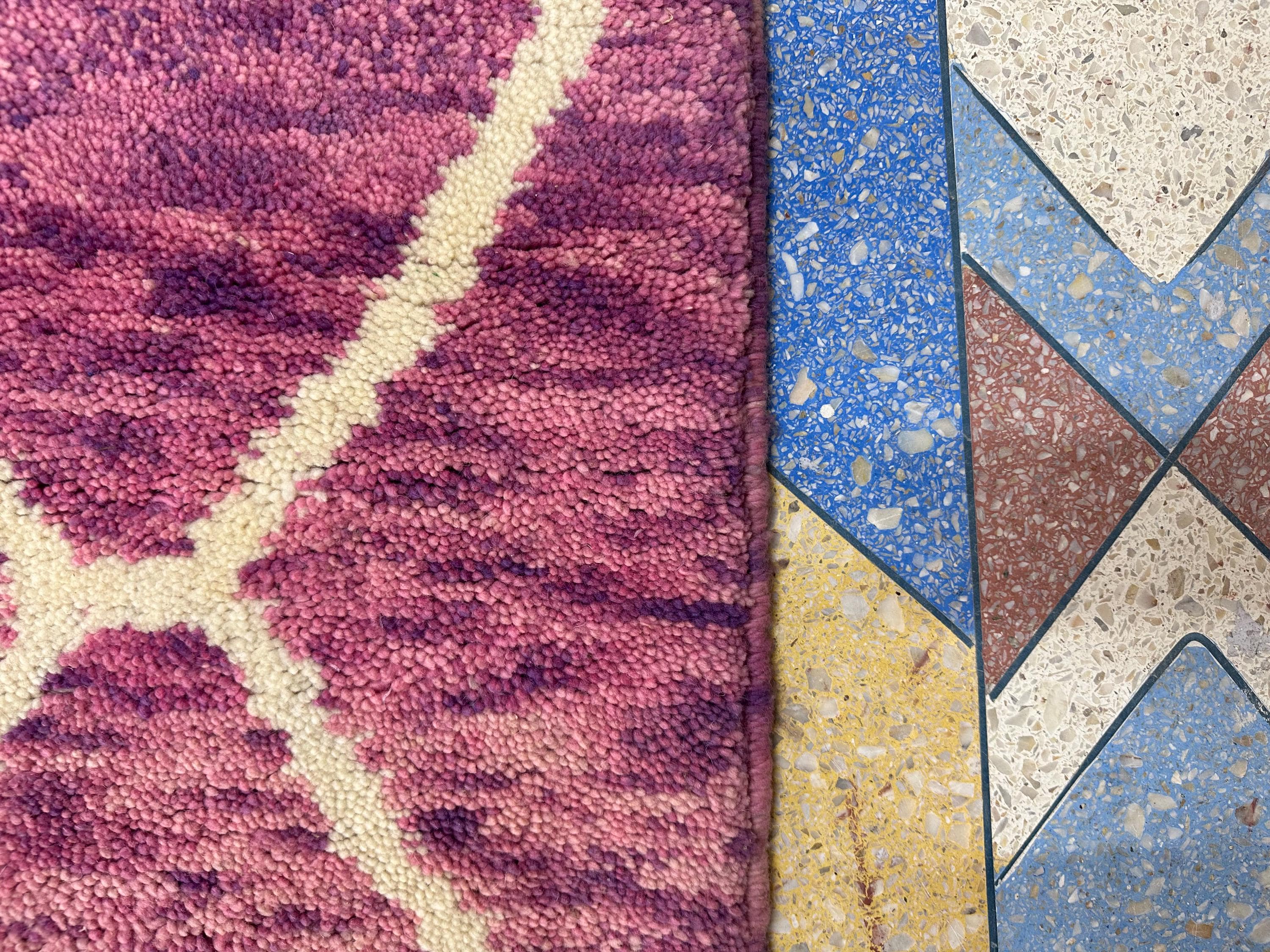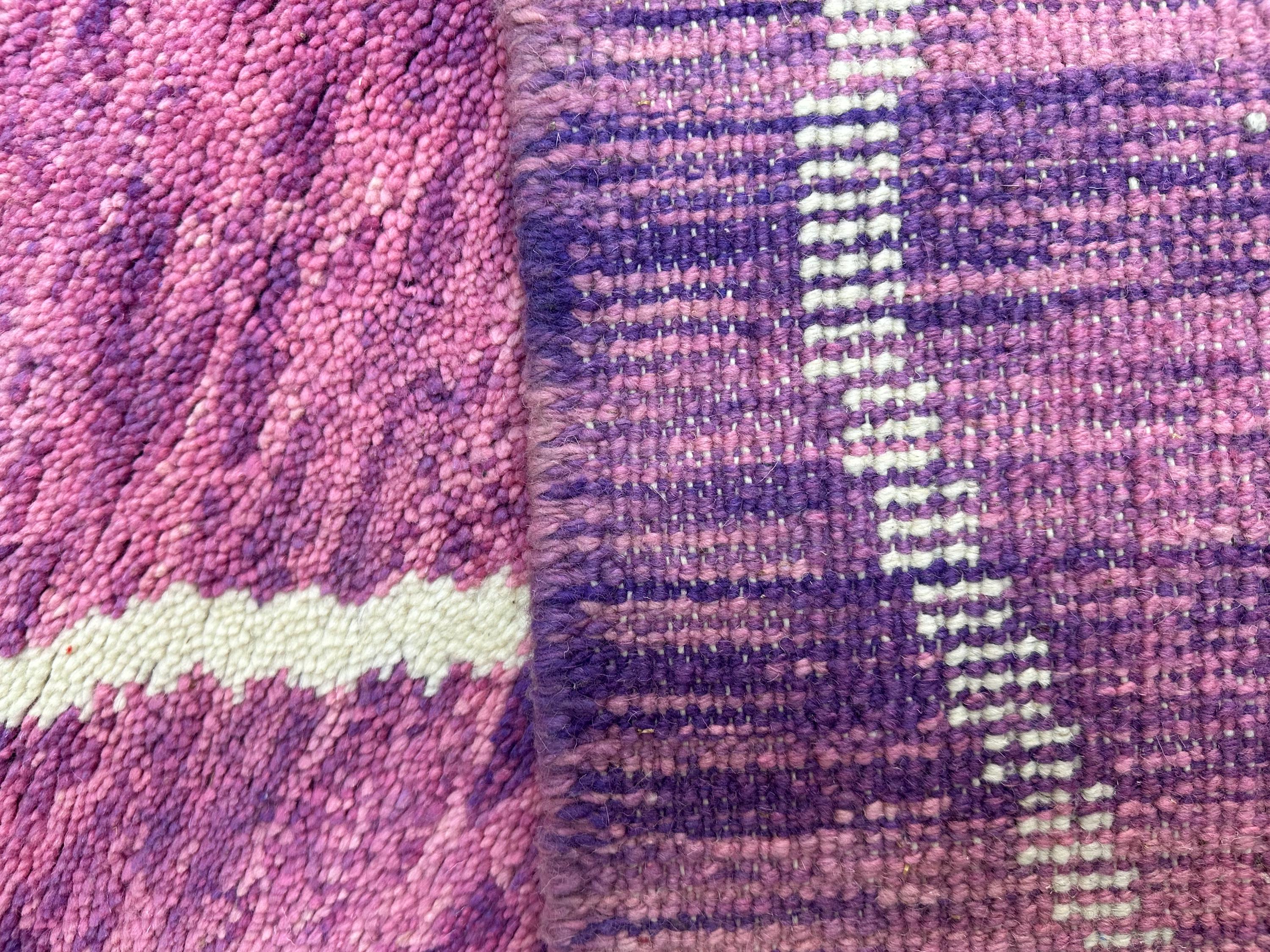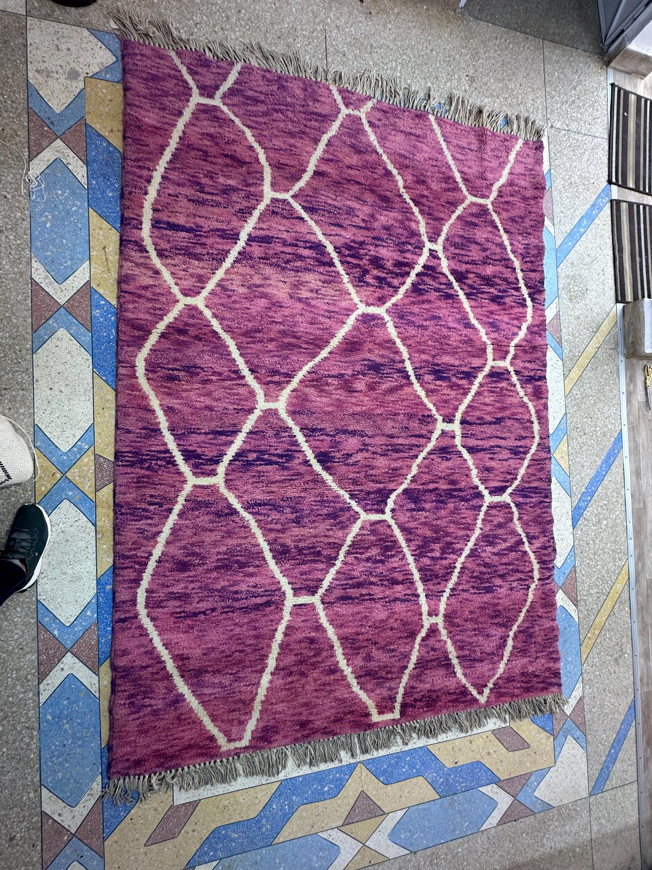 Make a bold yet cozy statement with this handmade purple & white Beni Ourain rug — soft wool, geometric design, and perfect for boho vibes.
