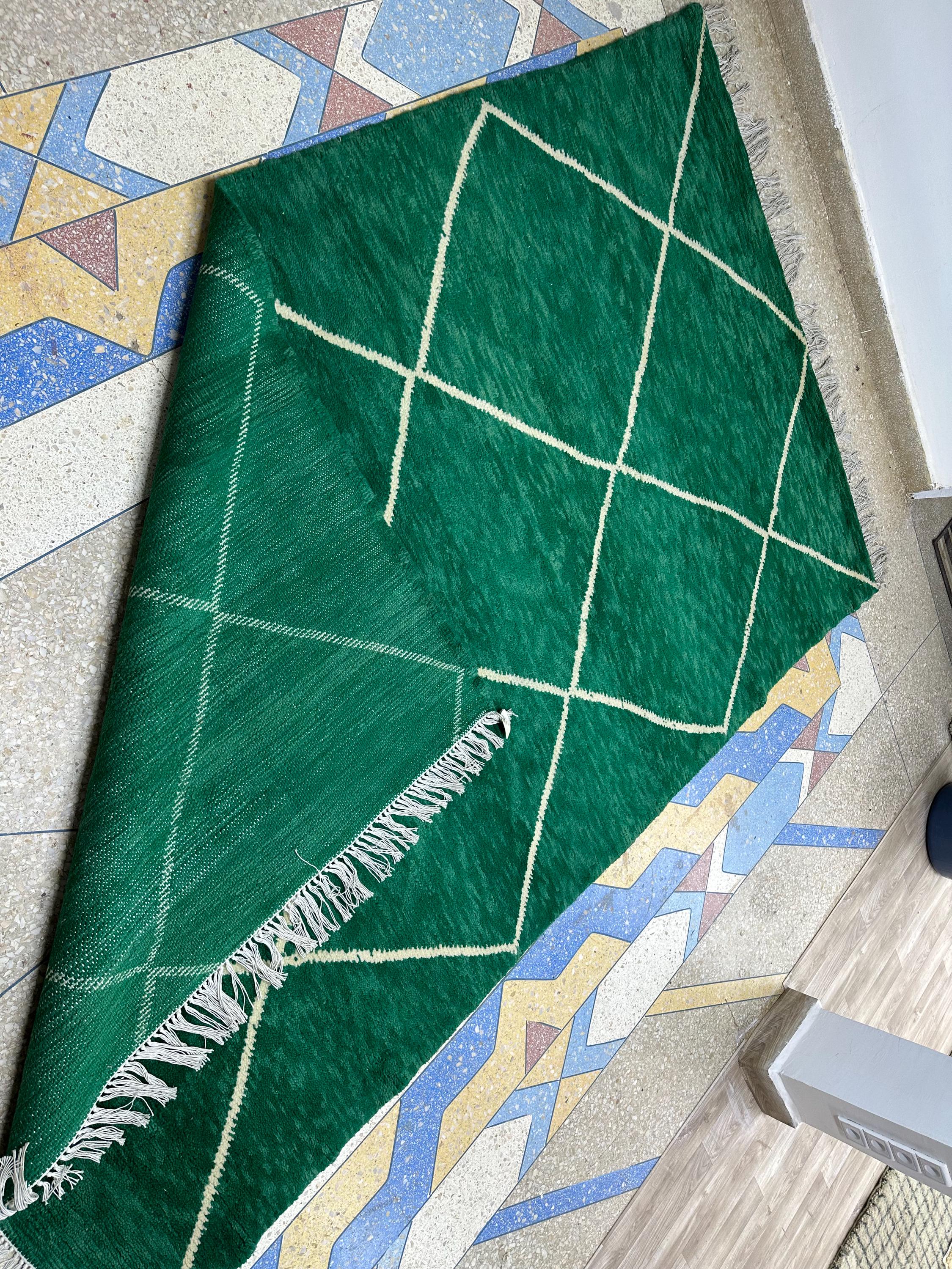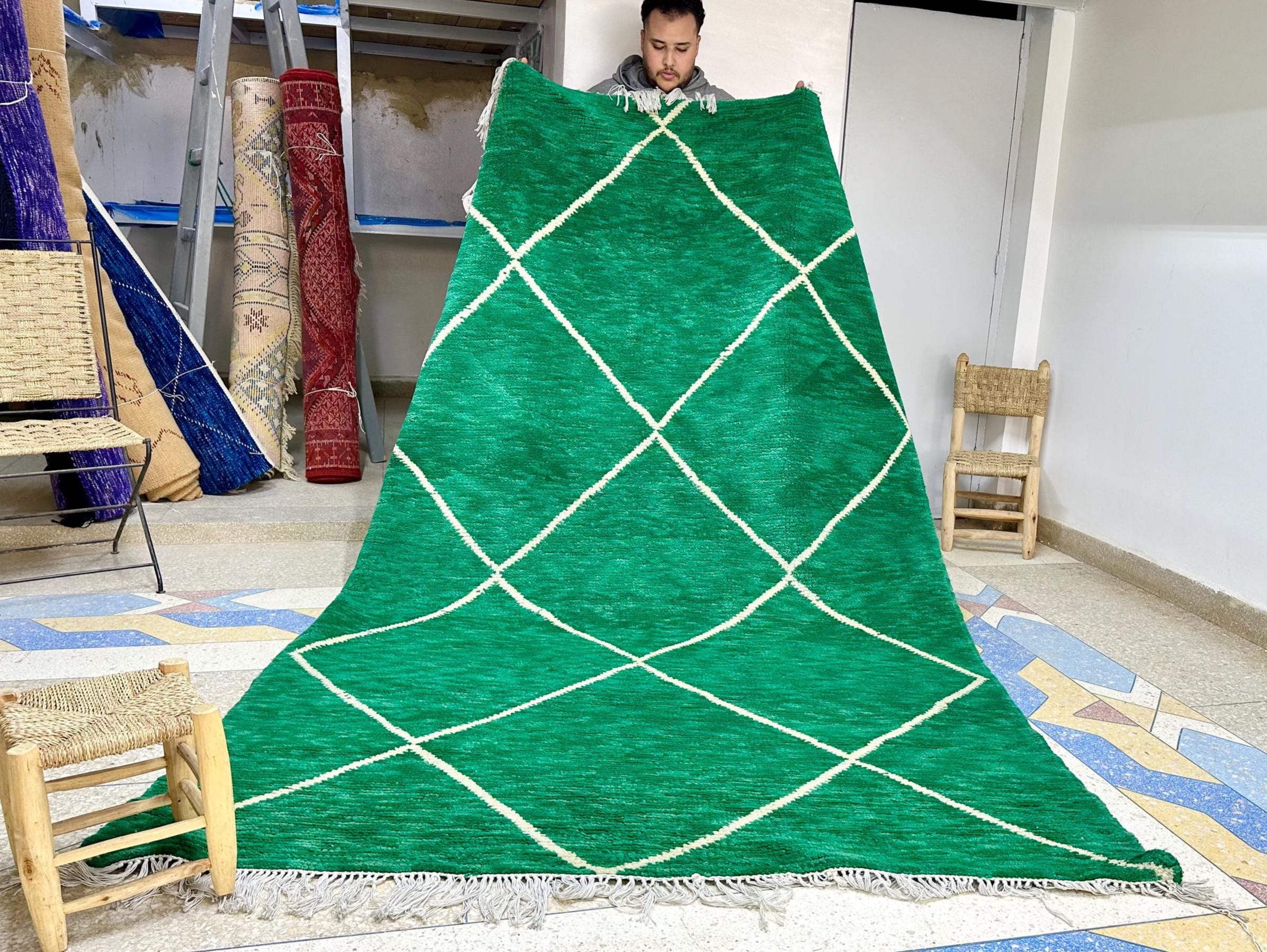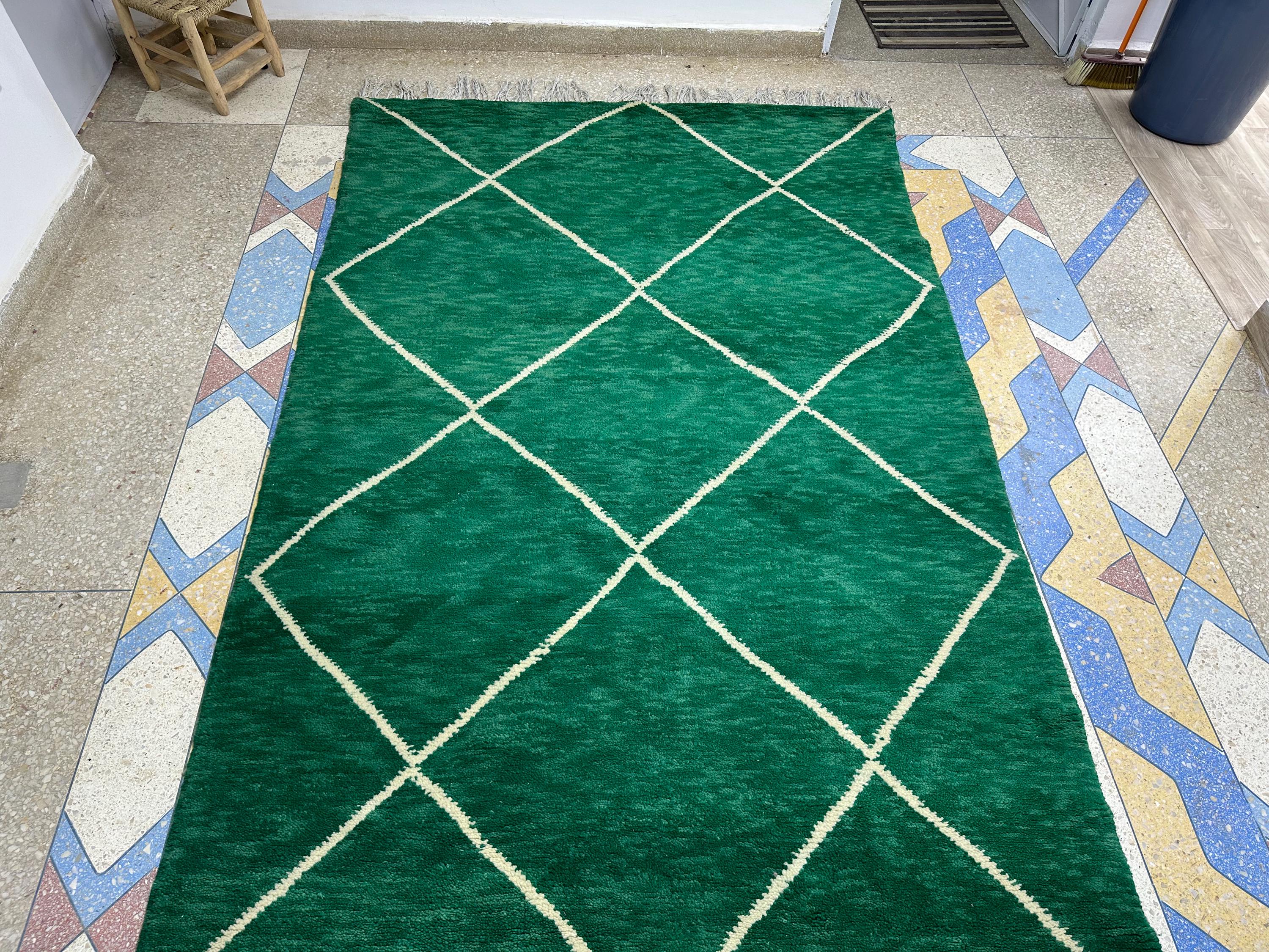 Elevate your interior with this Green and White Geometric Beni Ourain Rug, a handwoven Moroccan wool rug that seamlessly blends traditional Berber artistry with contemporary design. Crafted from 100% organic sheep wool, this custom handmade area rug features a striking geometric pattern, adding a touch of sophistication to any bohemian living room or bedroom. Its soft texture and durable construction make it a cozy and lasting addition to your home decor.