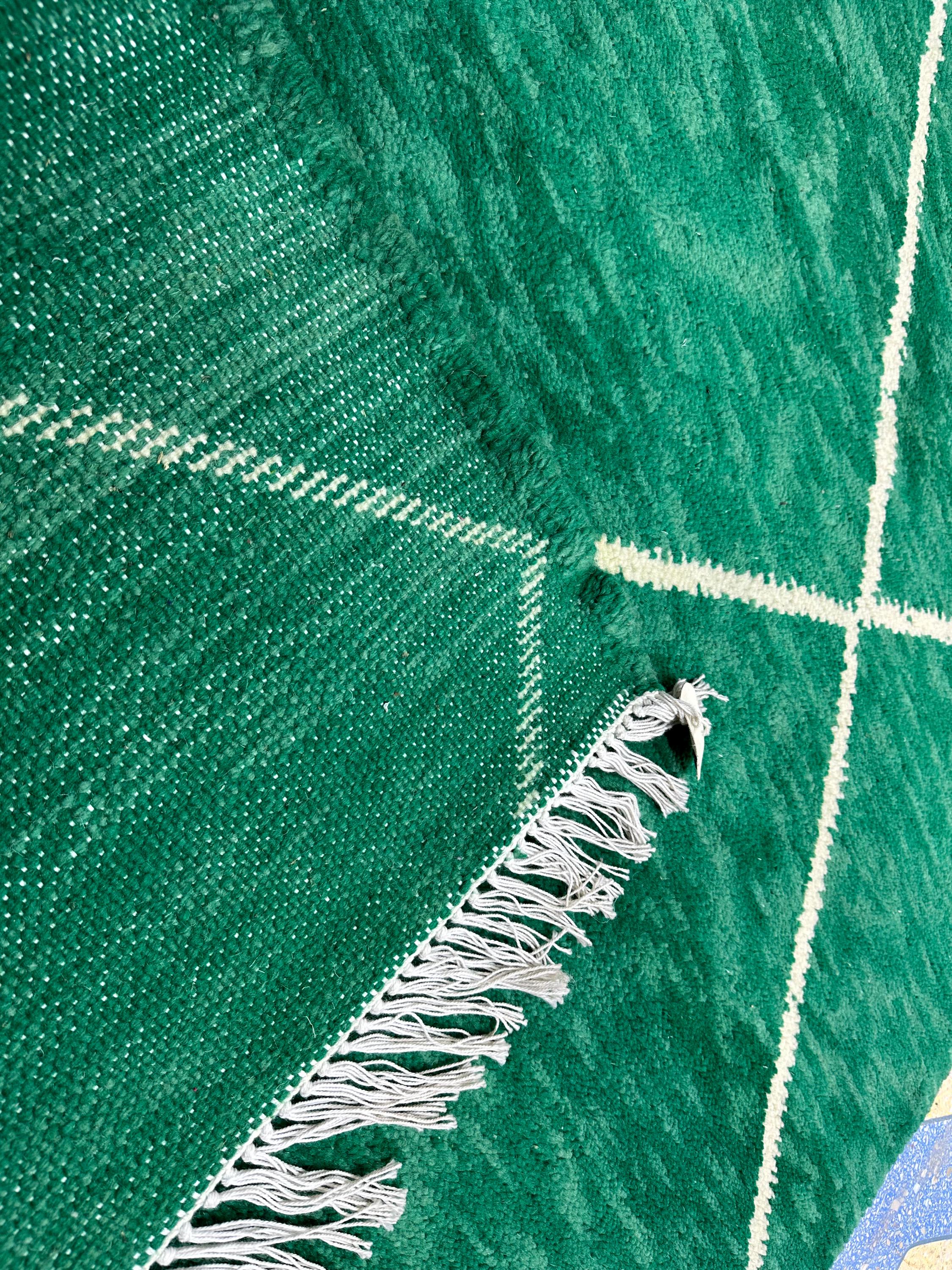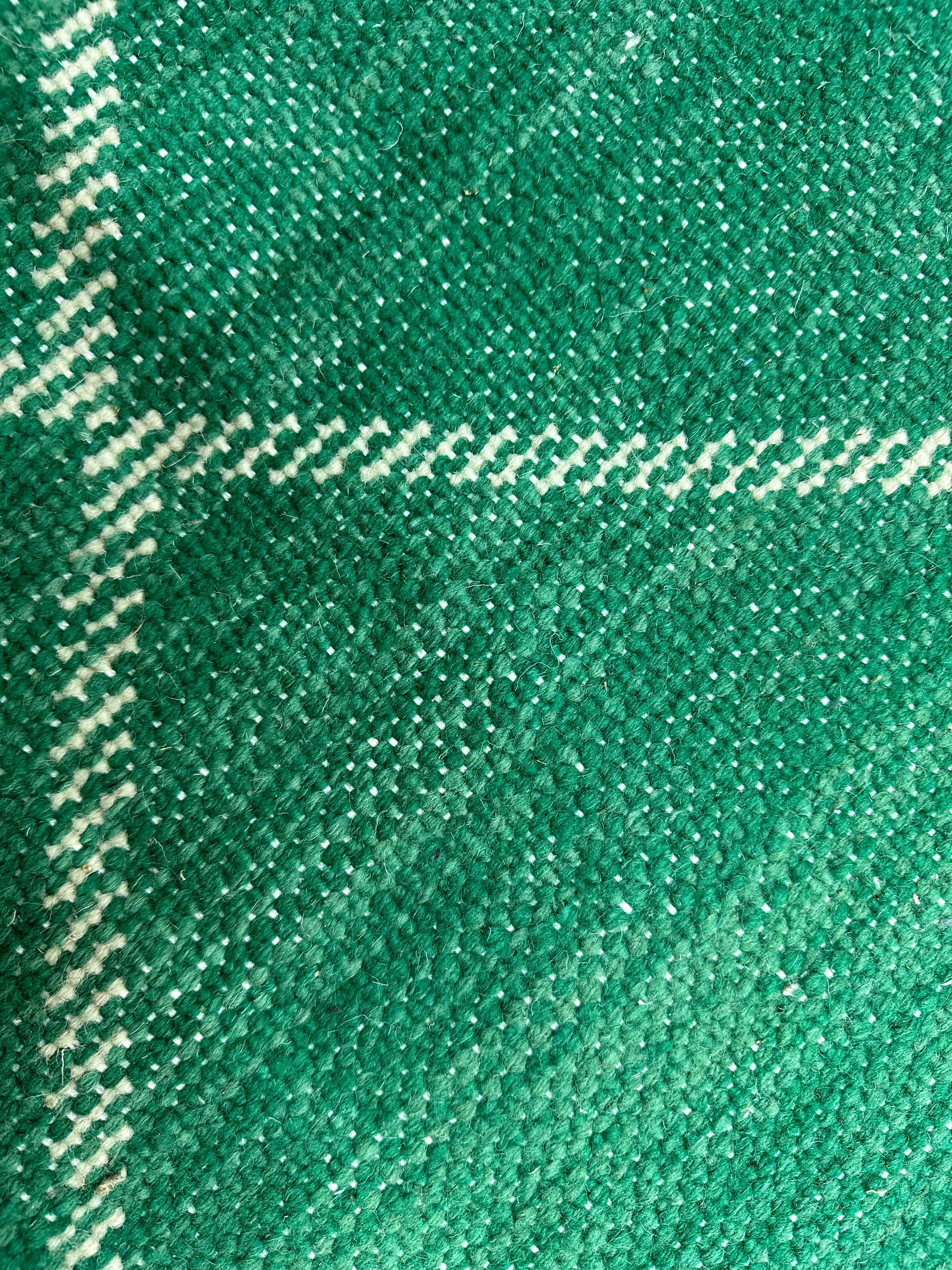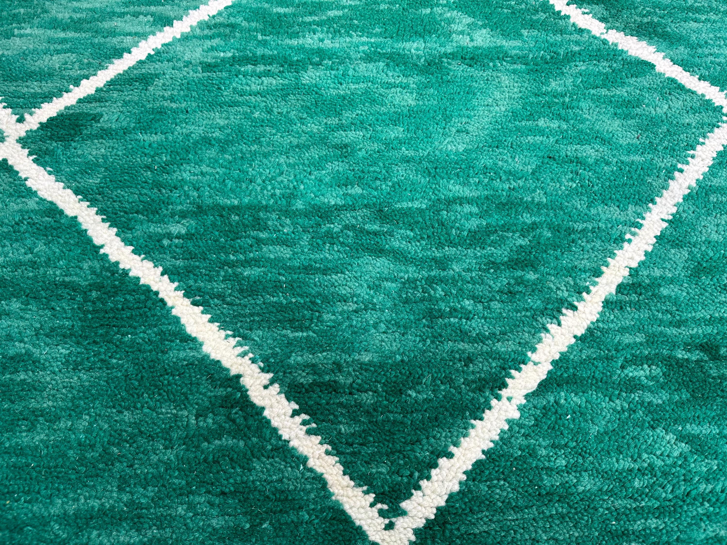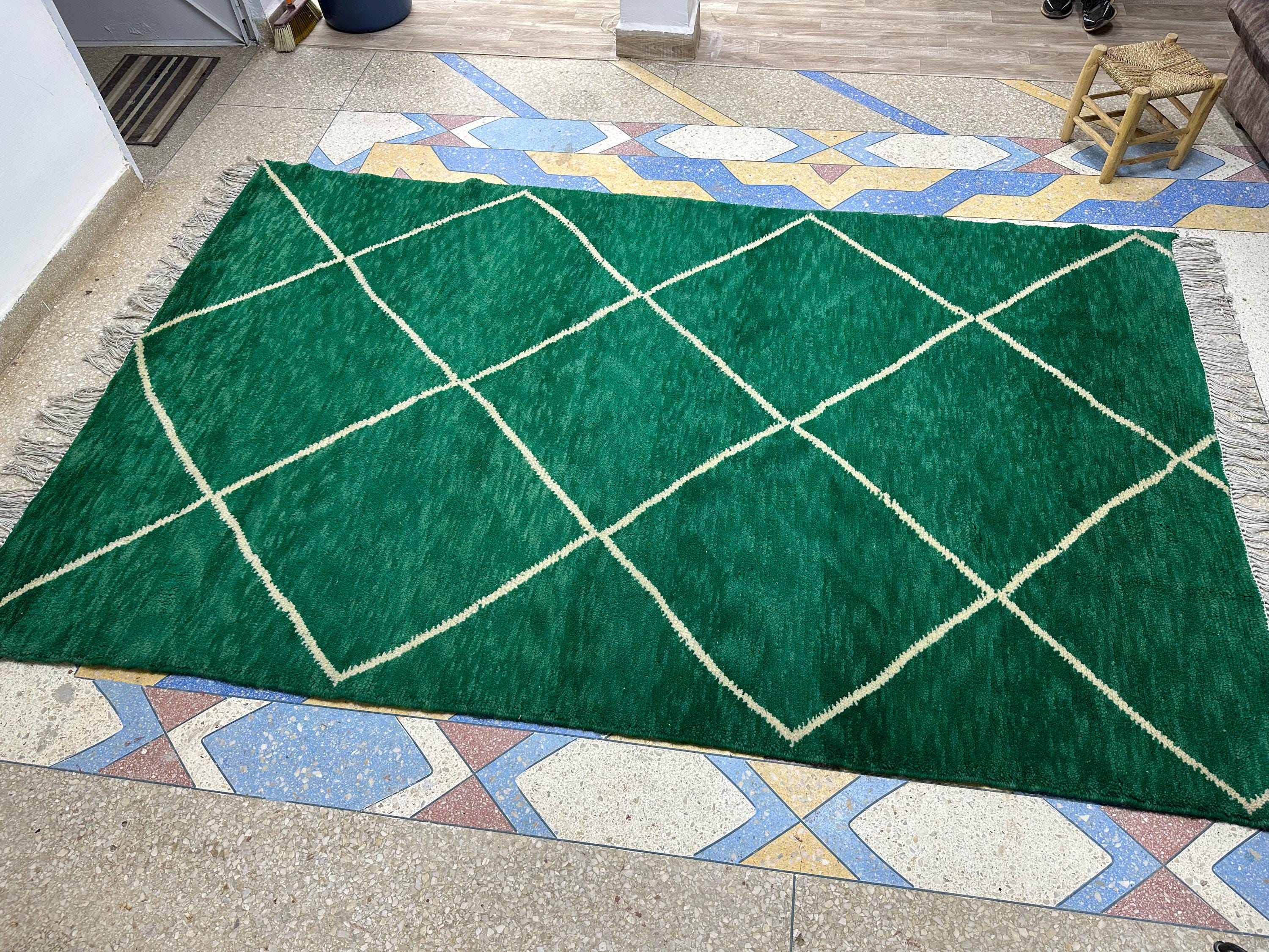 Elevate your interior with this Green and White Geometric Beni Ourain Rug, a handwoven Moroccan wool rug that seamlessly blends traditional Berber artistry with contemporary design. Crafted from 100% organic sheep wool, this custom handmade area rug features a striking geometric pattern, adding a touch of sophistication to any bohemian living room or bedroom. Its soft texture and durable construction make it a cozy and lasting addition to your home decor.