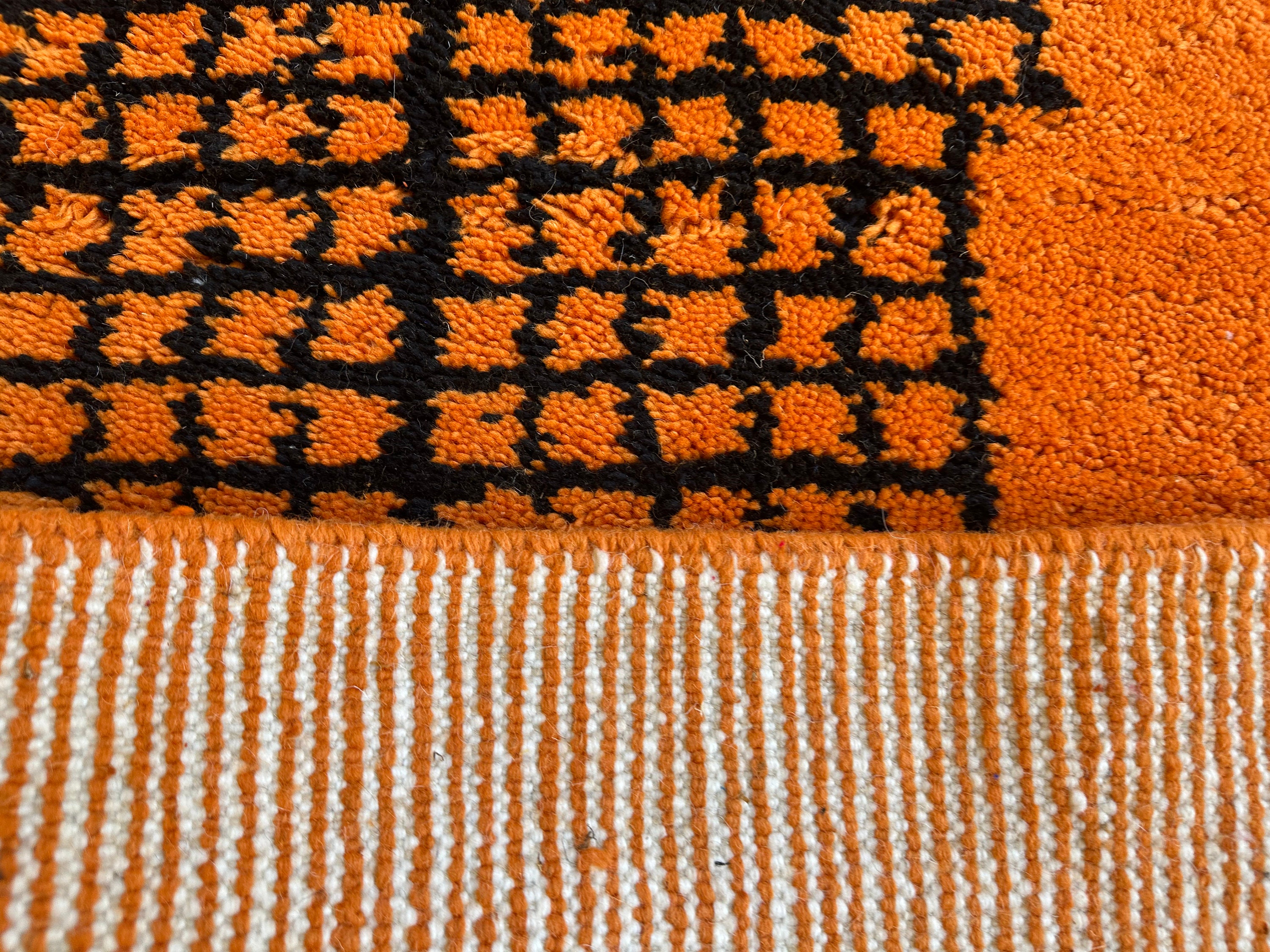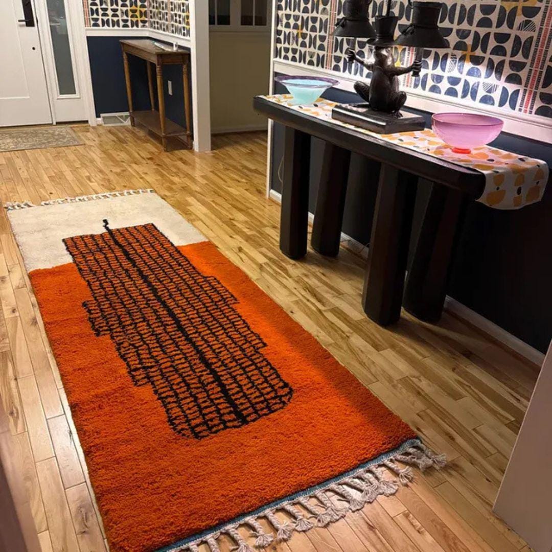 Add a touch of bohemian elegance to your home with this Orange and White Abstract Beni Ourain Runner Rug. Made from authentic handwoven sheep wool, this custom rug is perfect for your hallway, entryway, or any space needing a cozy, vibrant touch. Its unique geometric design and soft texture make it an ideal addition to bohemian home decor, creating a welcoming and stylish atmosphere.