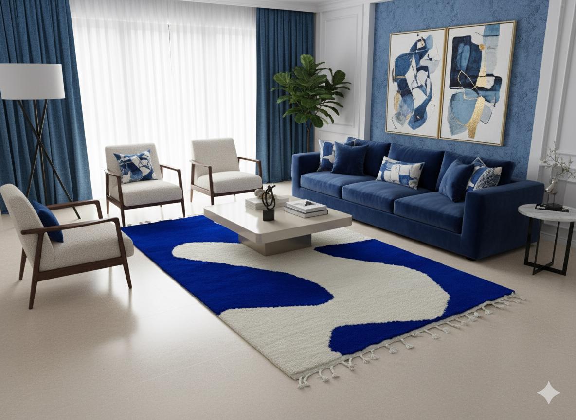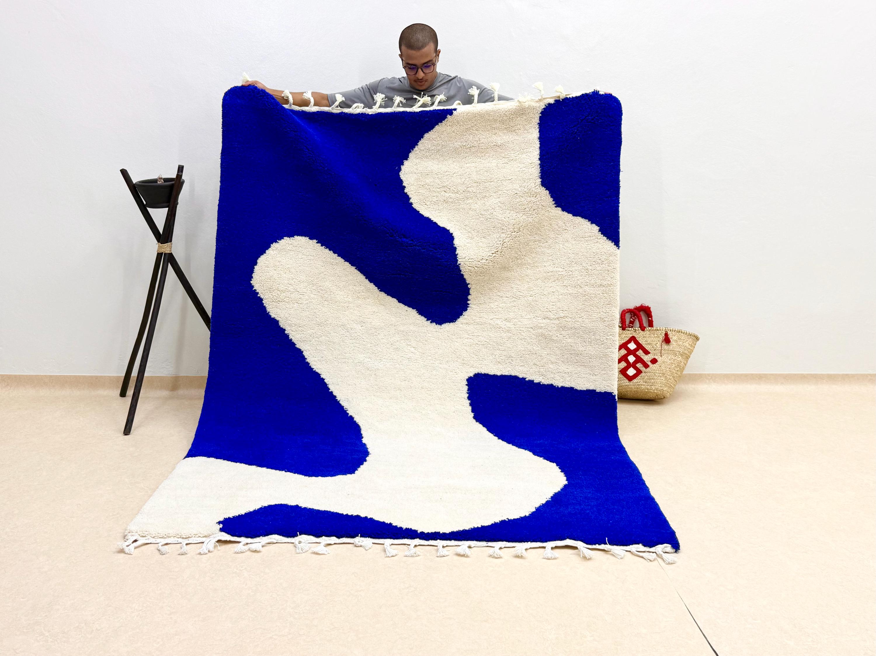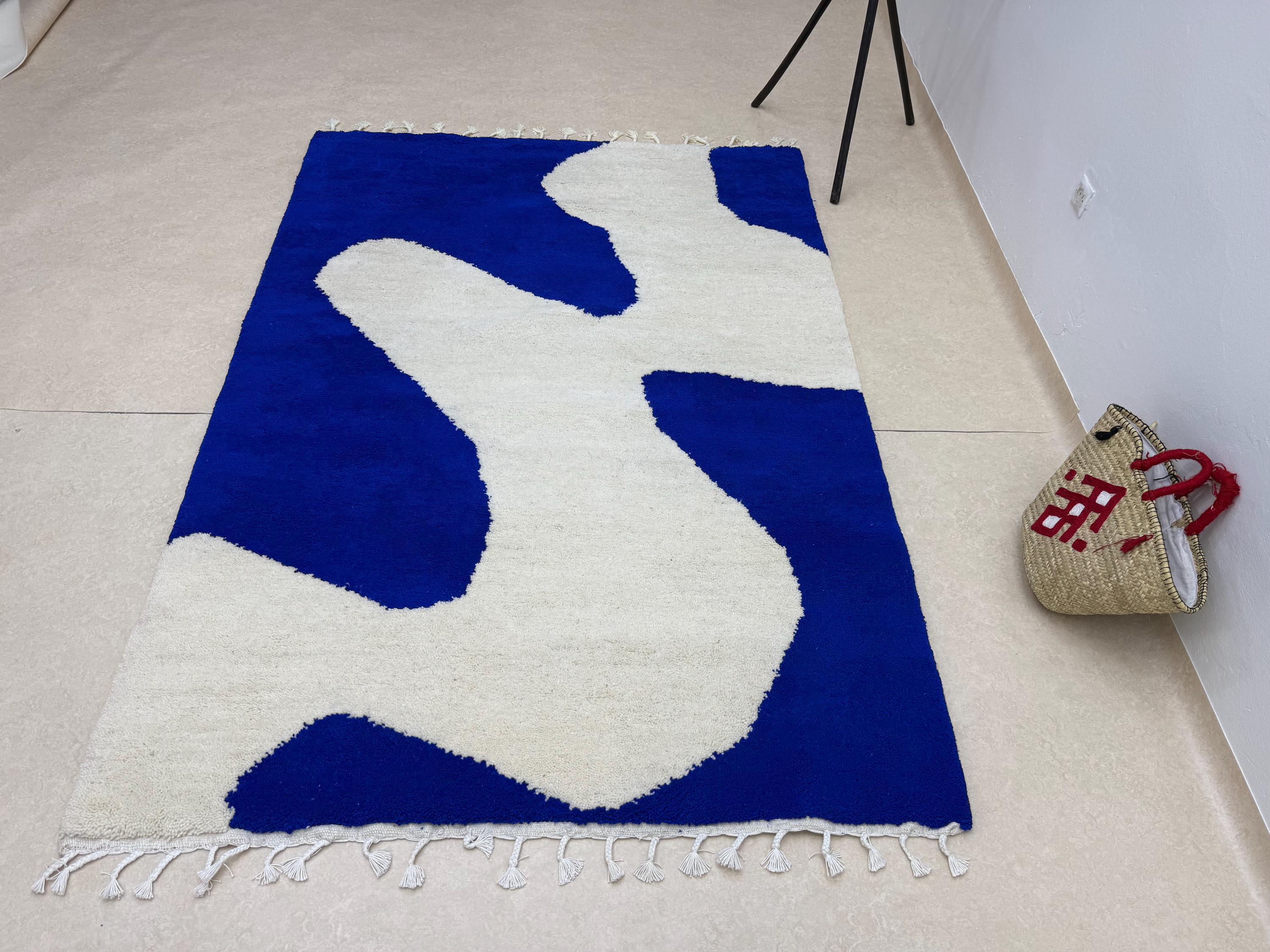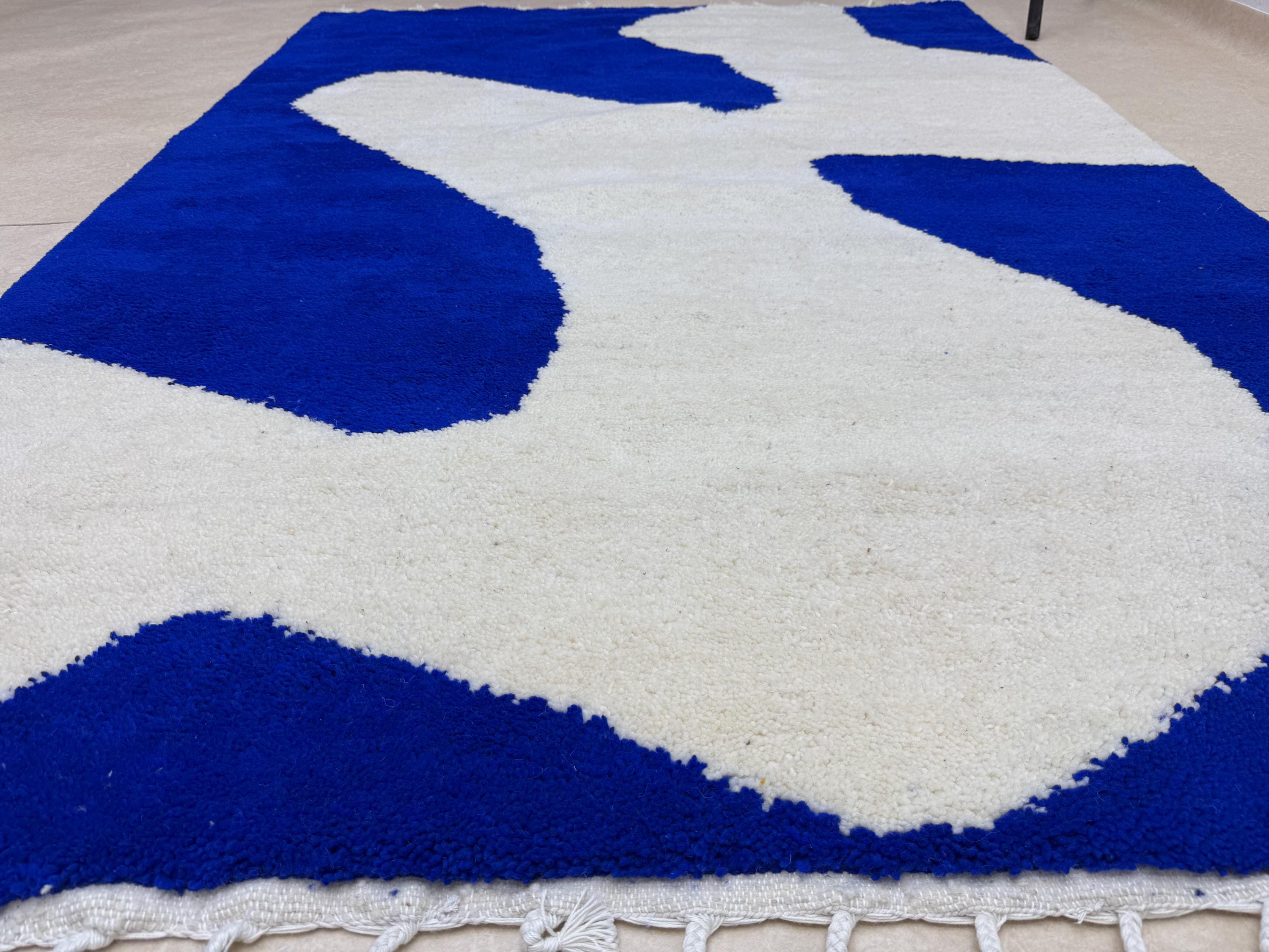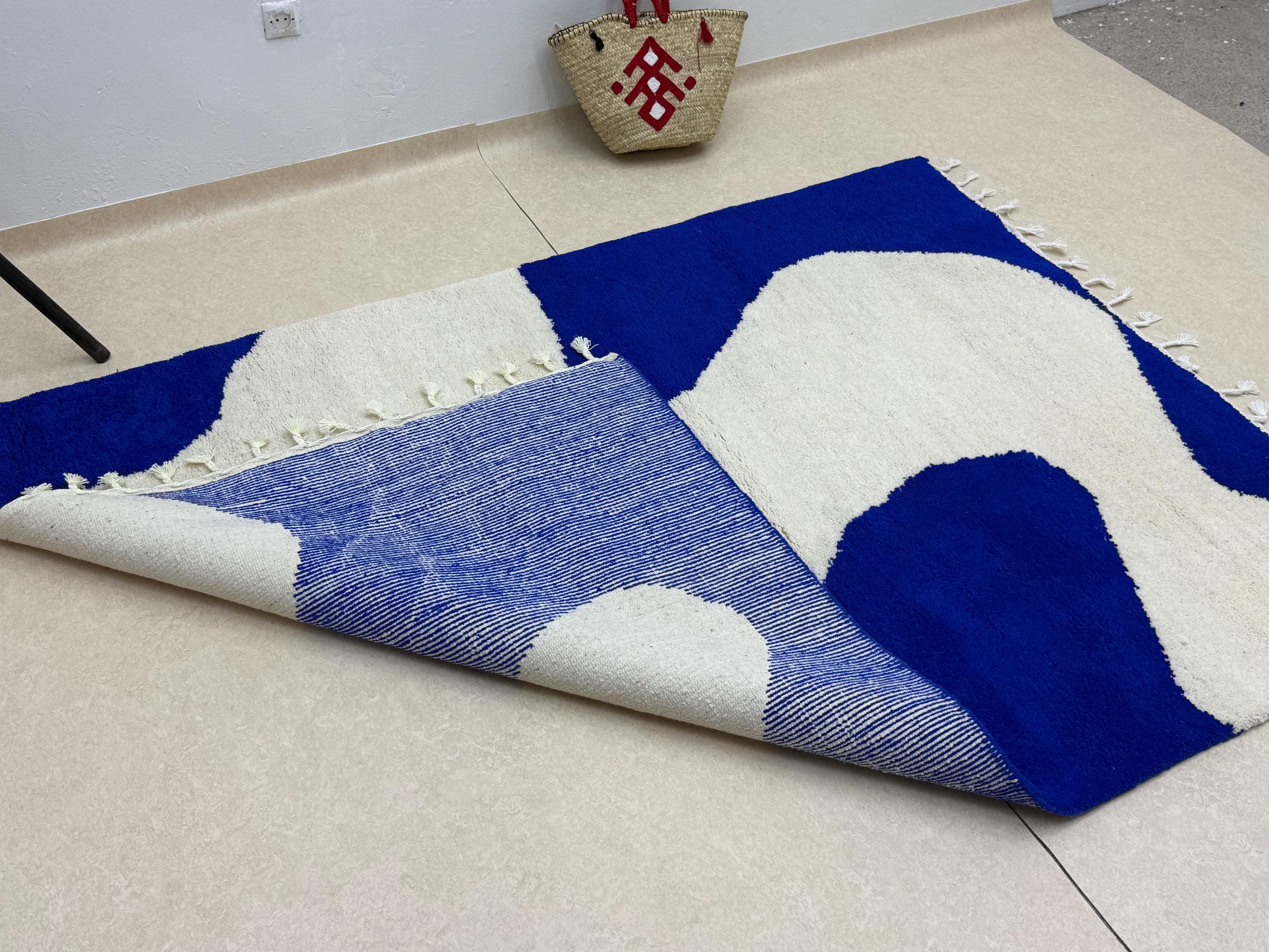 Elevate your space with this modern area rug featuring blue & white Moroccan wool, custom Beni Ourain design, and Berber style with blue abstract motifs. This cozy, handmade floor rug adds a touch of warmth and sophistication to any room. Perfect for adding a stylish statement piece to your home decor.