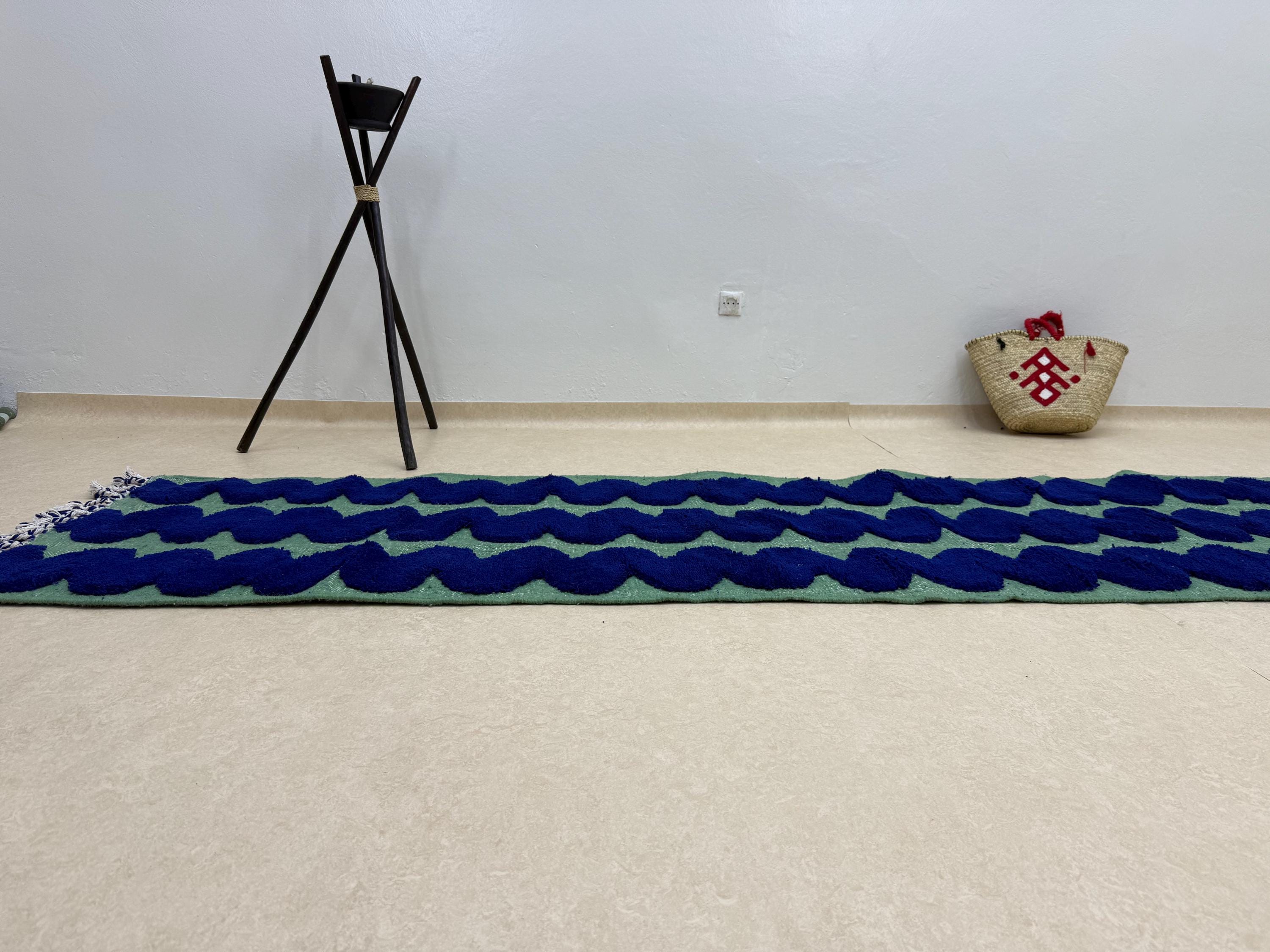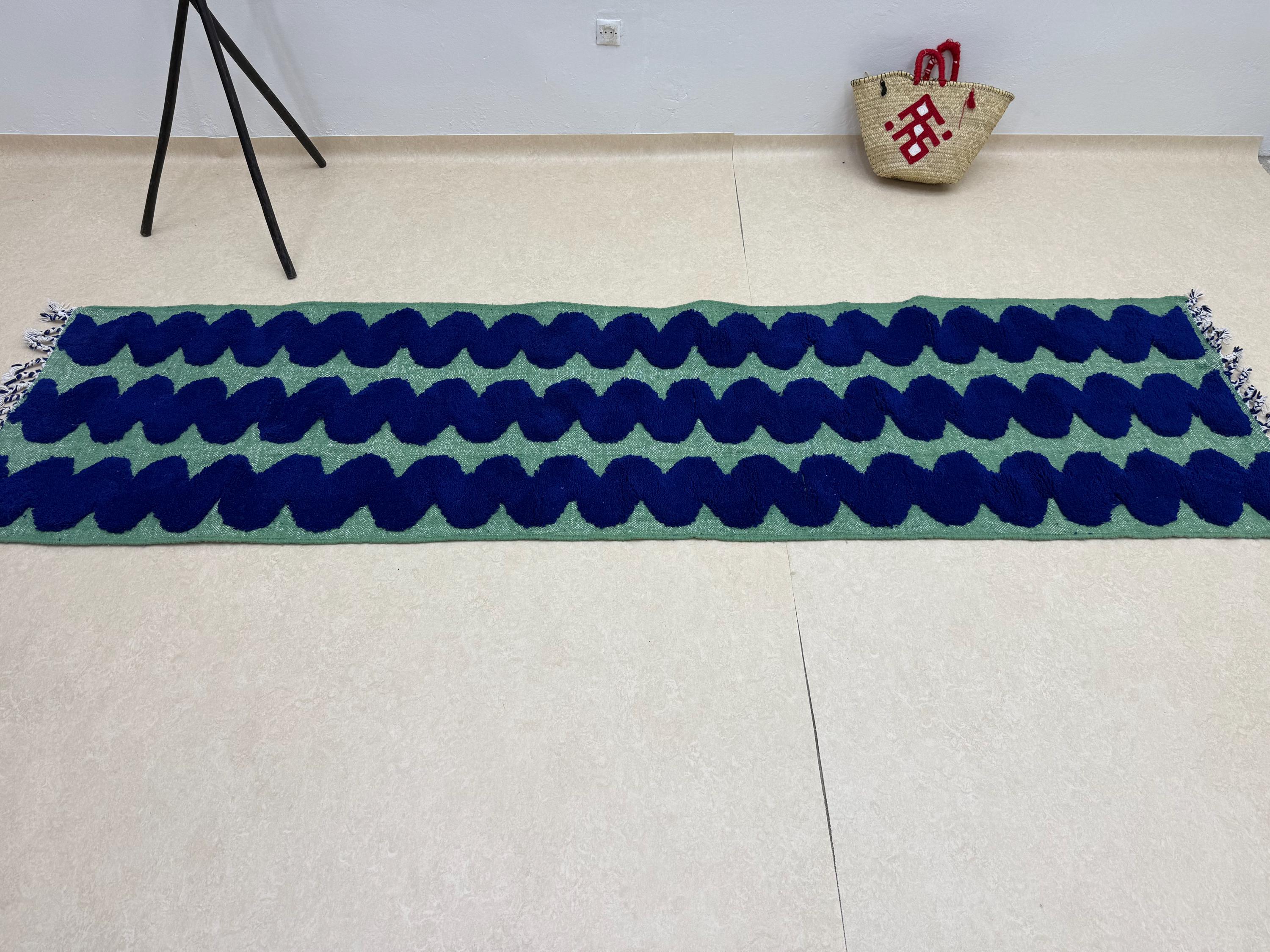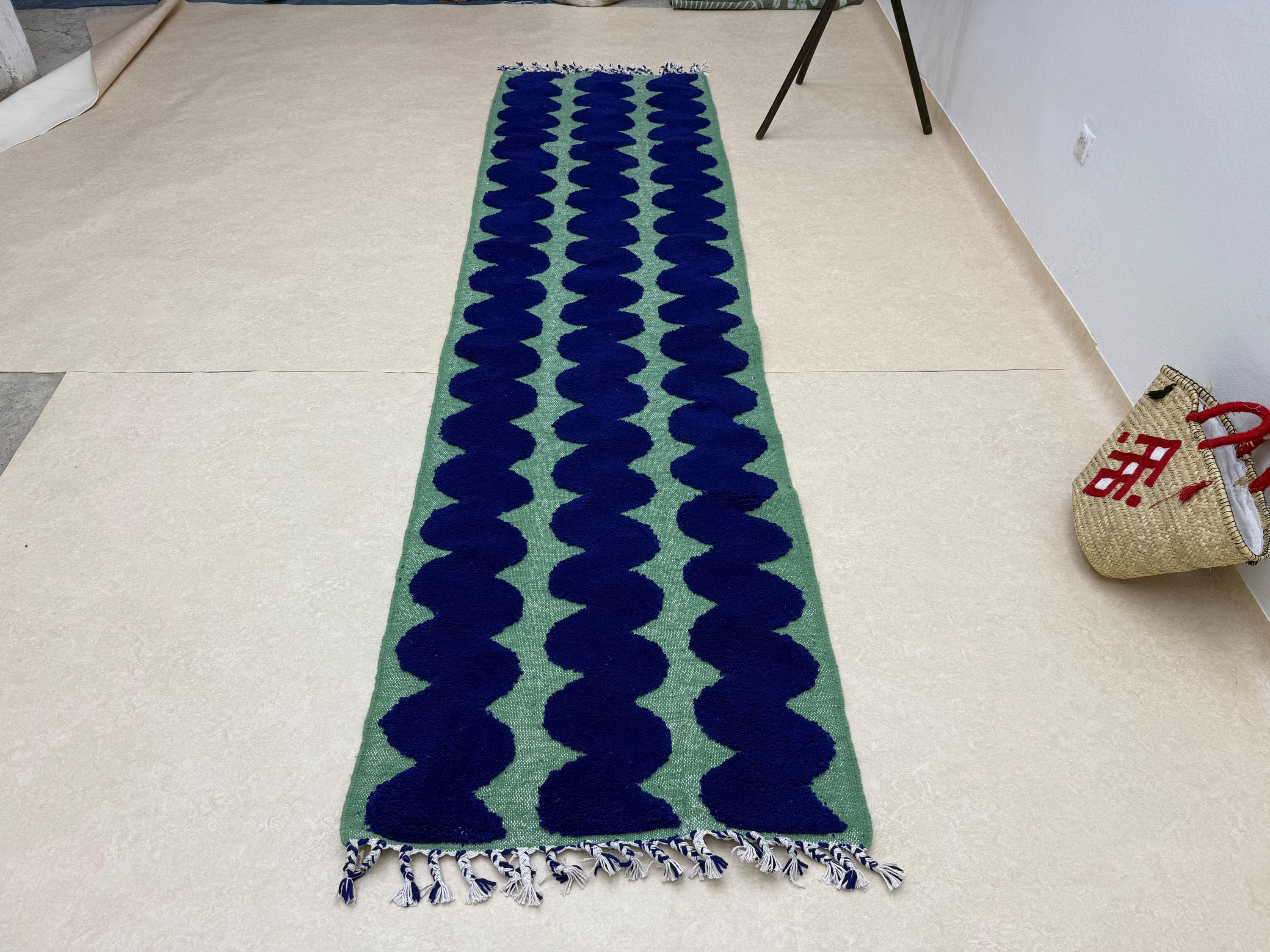 Soft handwoven Moroccan wool meets vibrant blue‑green stripes in this custom Abstract Beni Ourain runner—perfect for cozy hallways in modern bohemian or eclectic interiors.