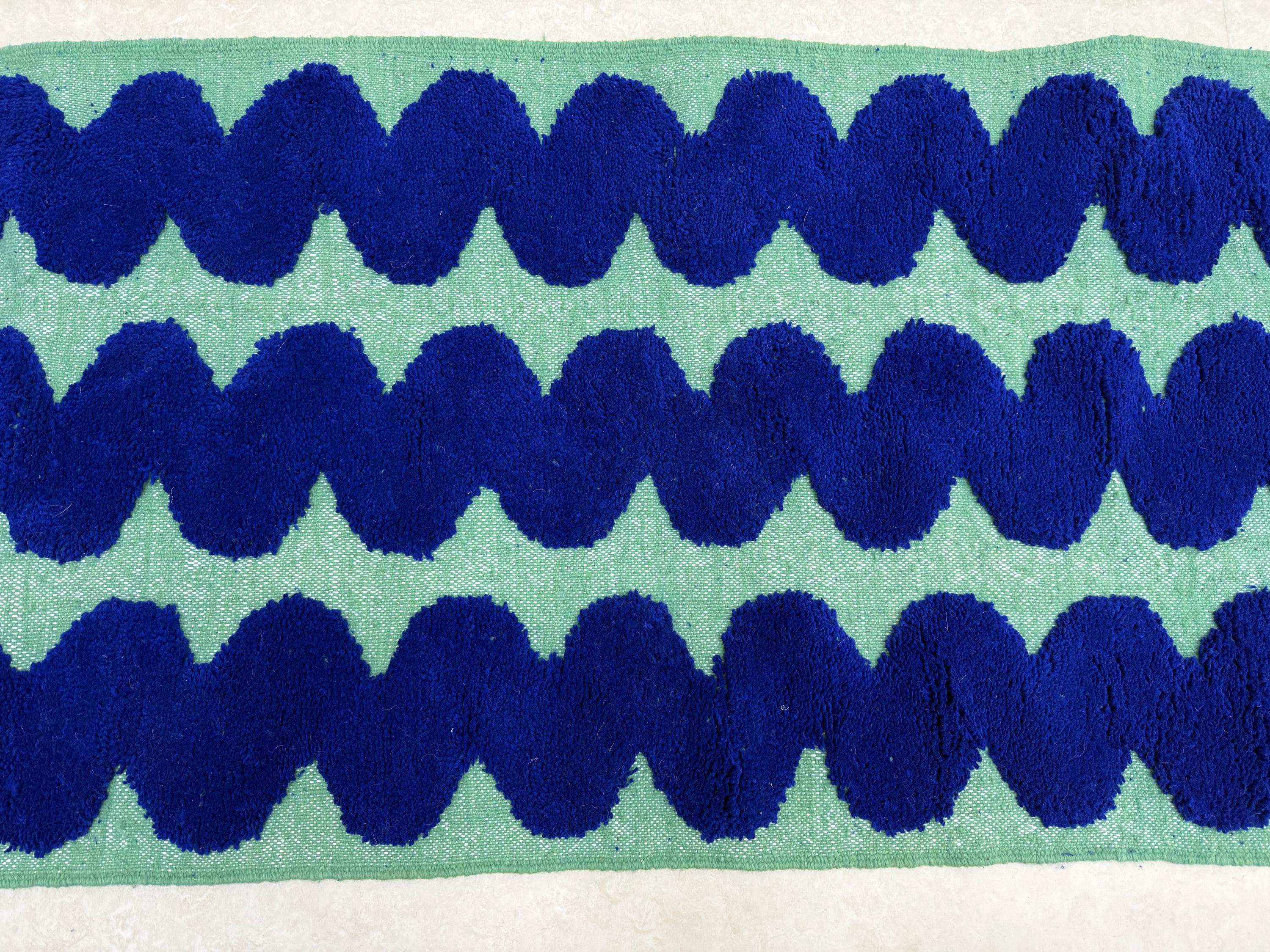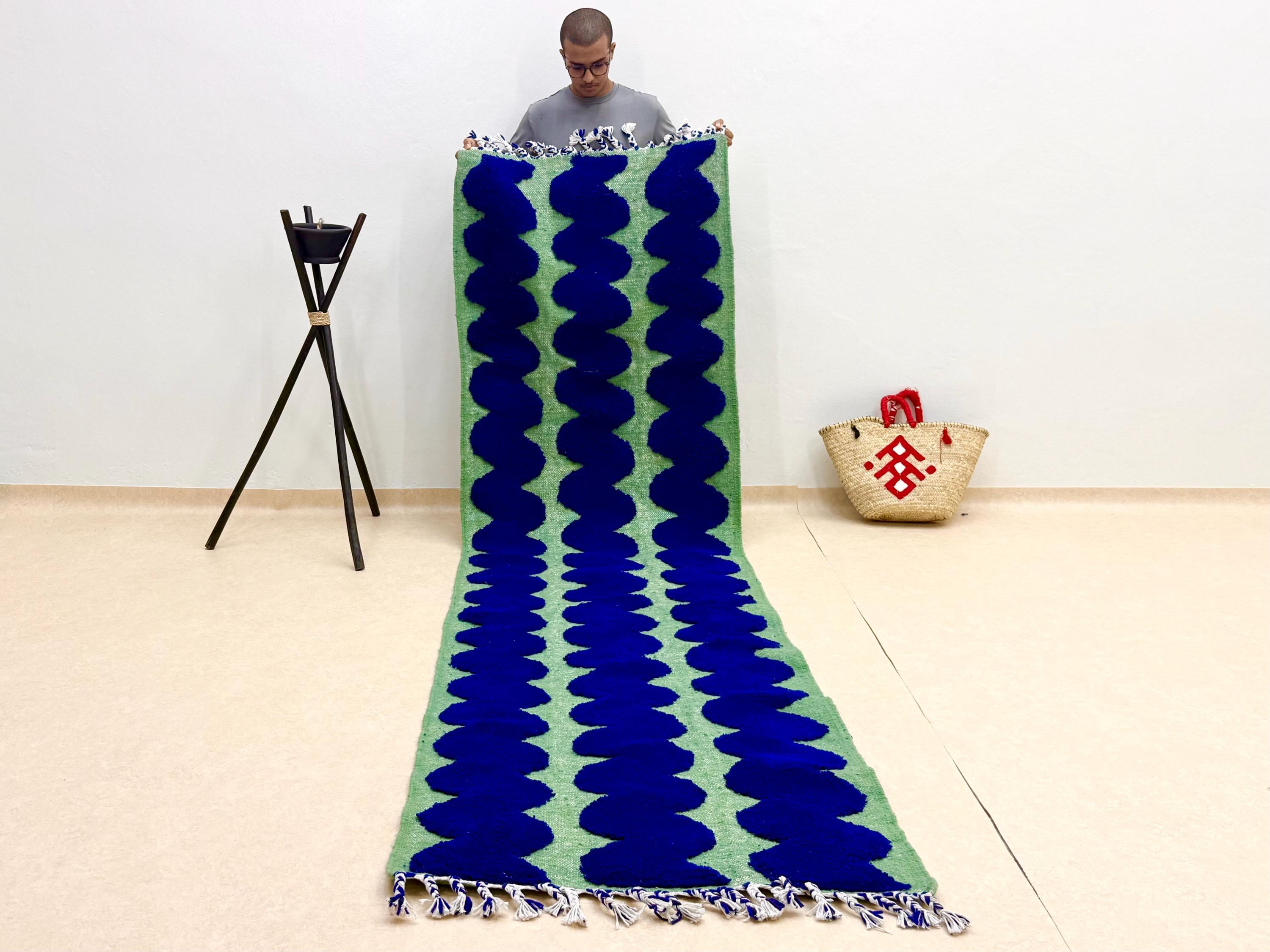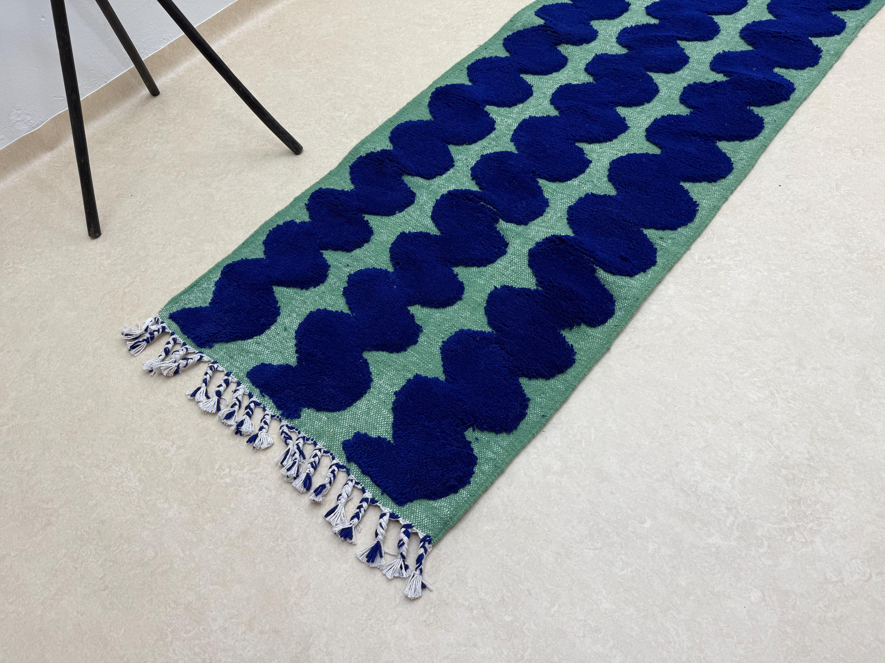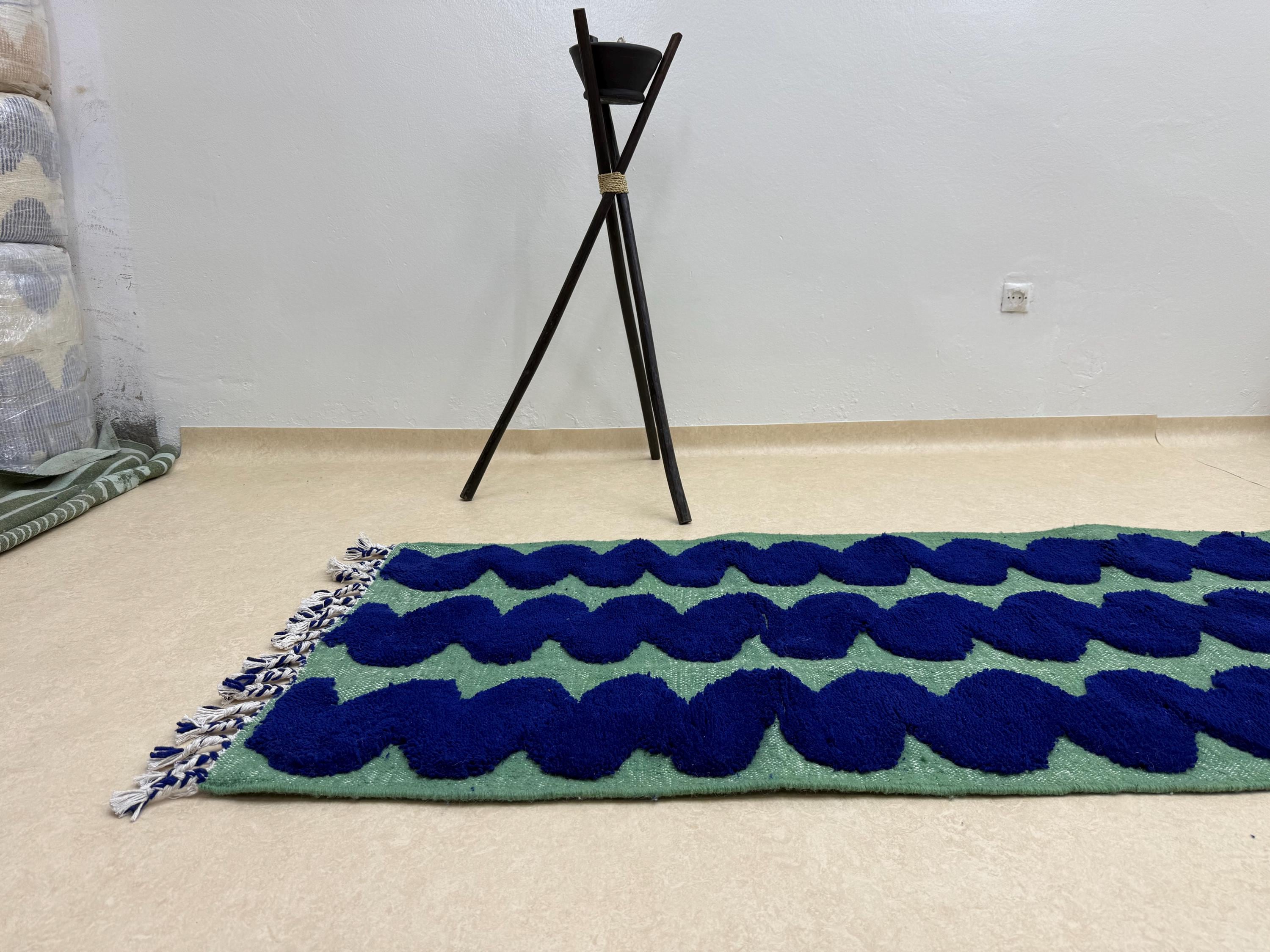 Soft handwoven Moroccan wool meets vibrant blue‑green stripes in this custom Abstract Beni Ourain runner—perfect for cozy hallways in modern bohemian or eclectic interiors.