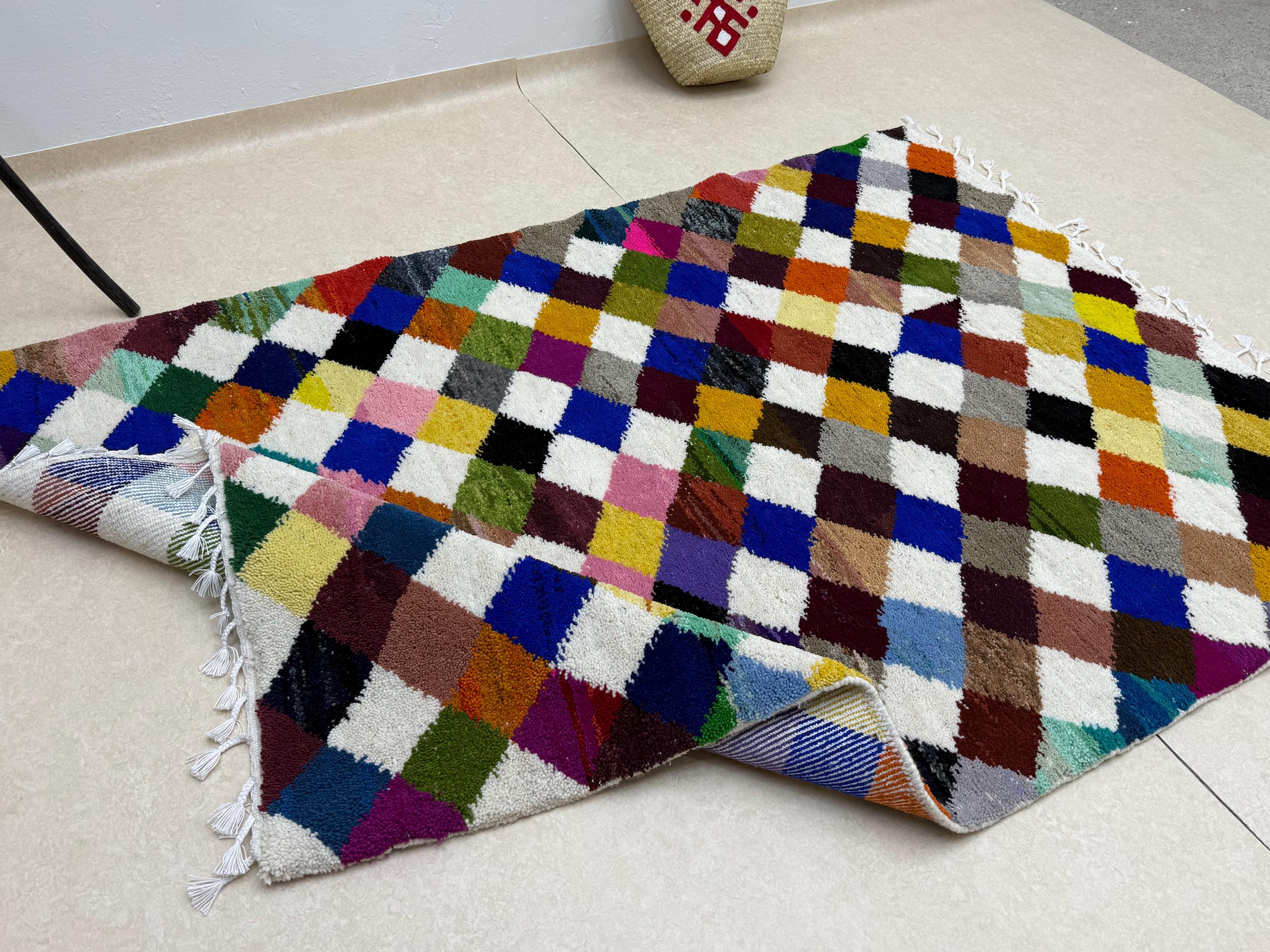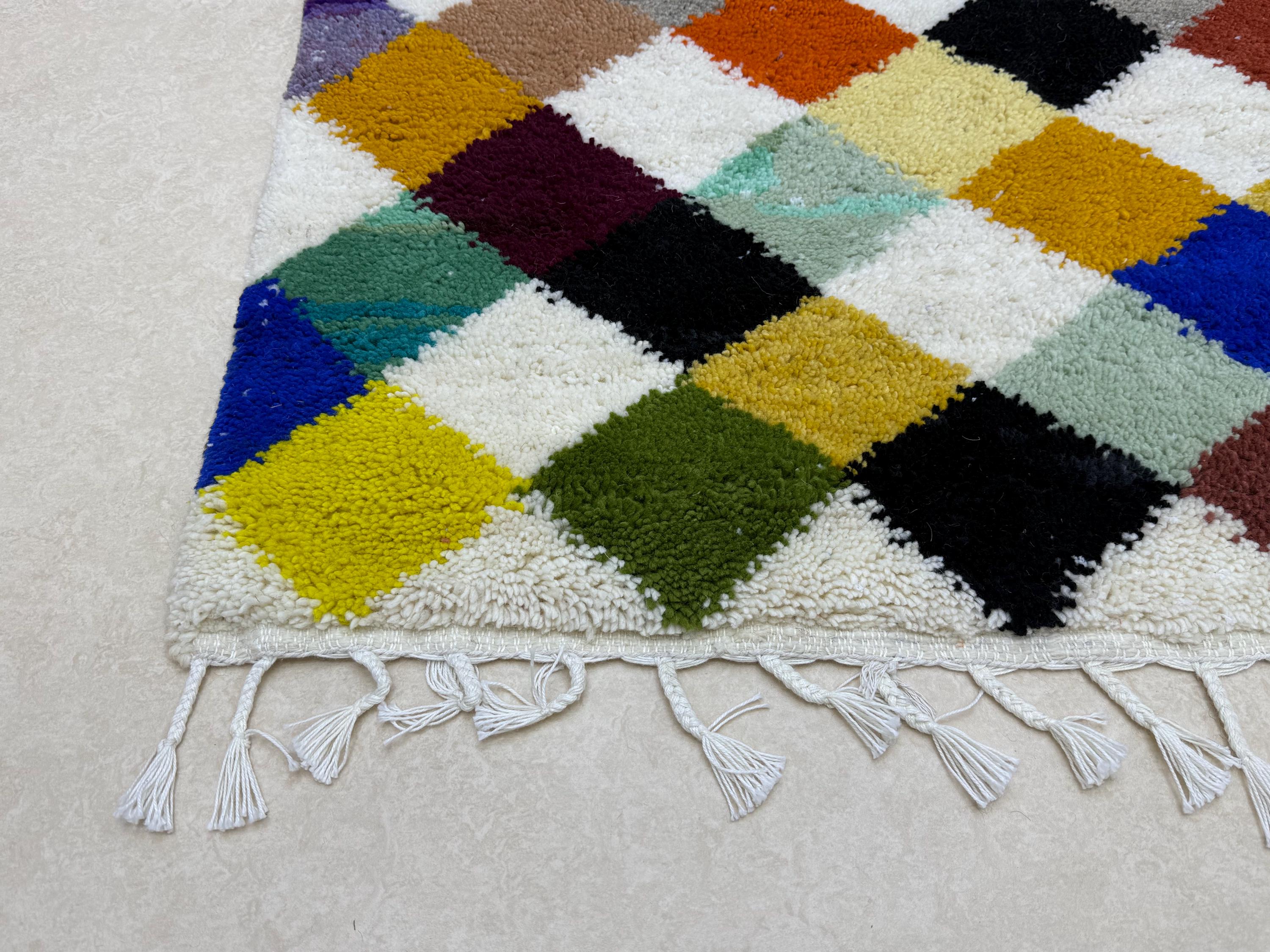 Make a bold statement with this handcrafted 9x8FT multicolor Moroccan Beni Ourain rug, featuring geometric patterns and soft wool – perfect for boho, eclectic, or modern interiors.