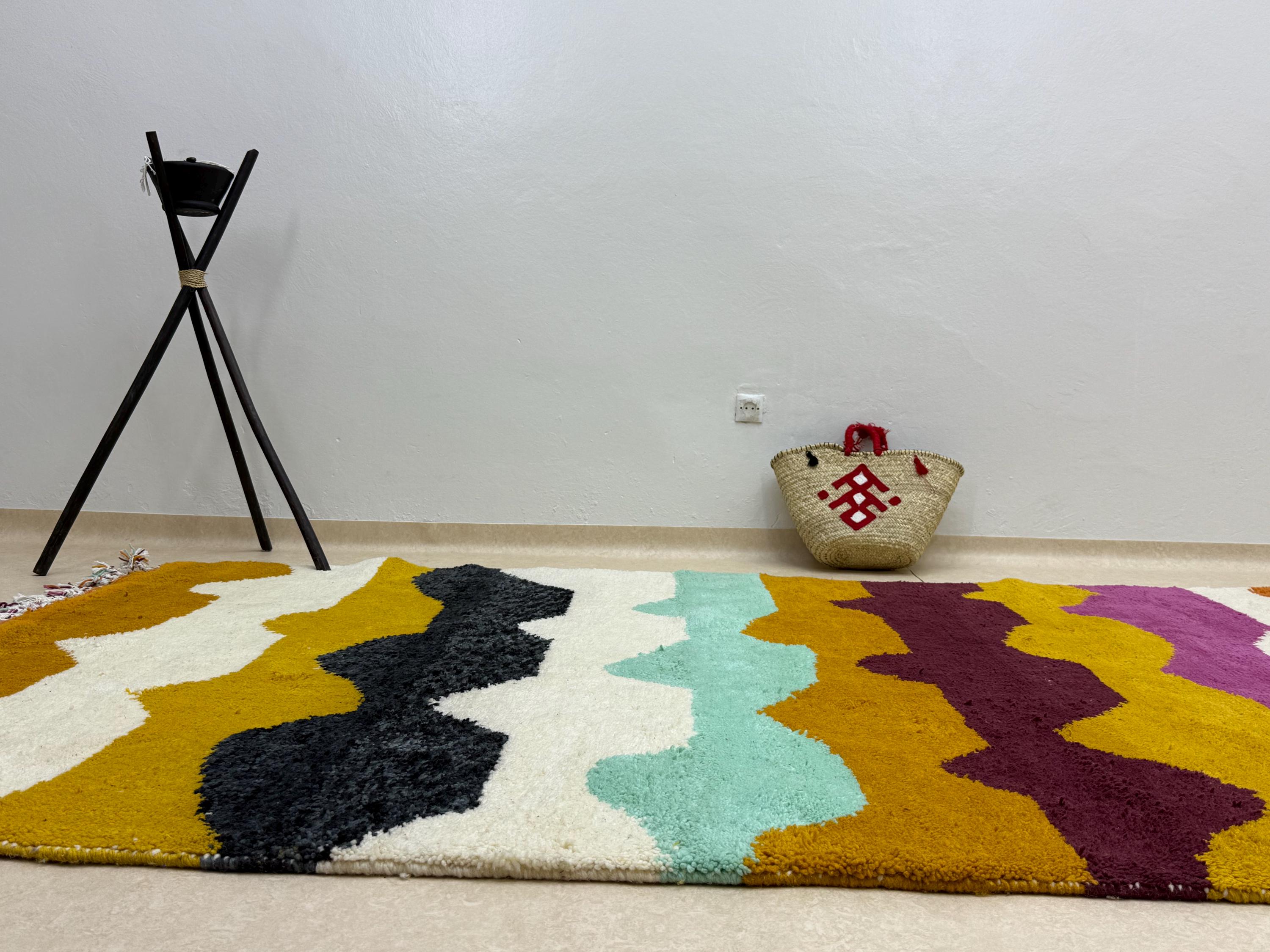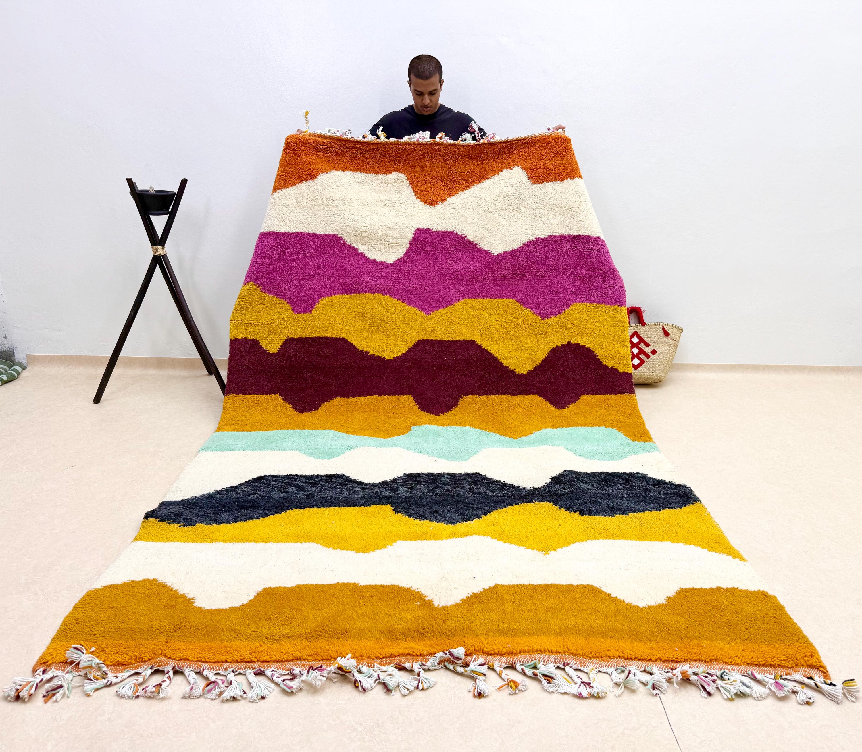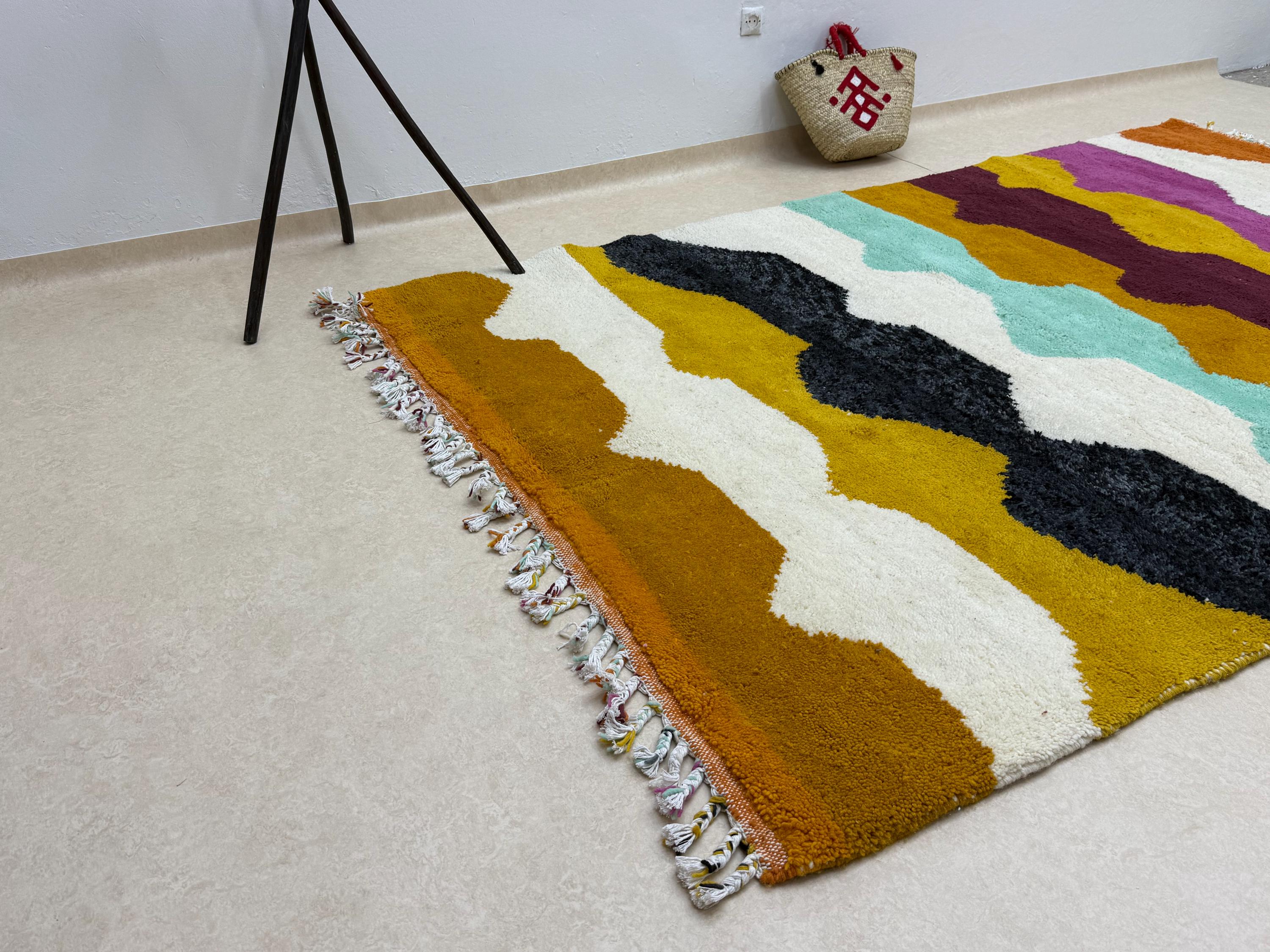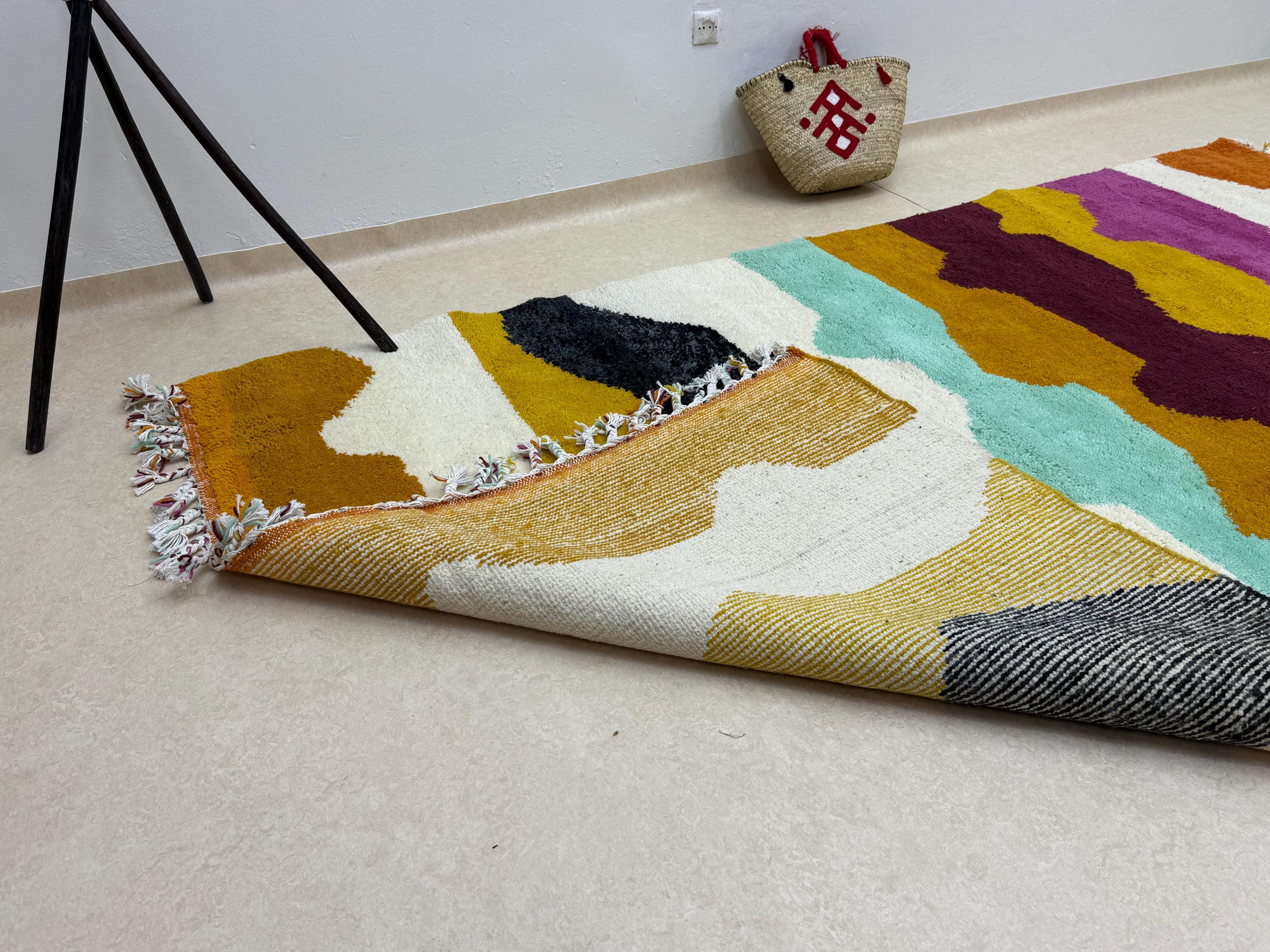 Bring a touch of Moroccan beauty into your home with this fabulous Beni Ourain rug. Handcrafted from shaggy, high-quality wool, this custom size Berber rug features a stunning multicolor abstract design, making it the perfect addition to elevate your space. Add a unique flair to your decor with this one-of-a-kind piece!