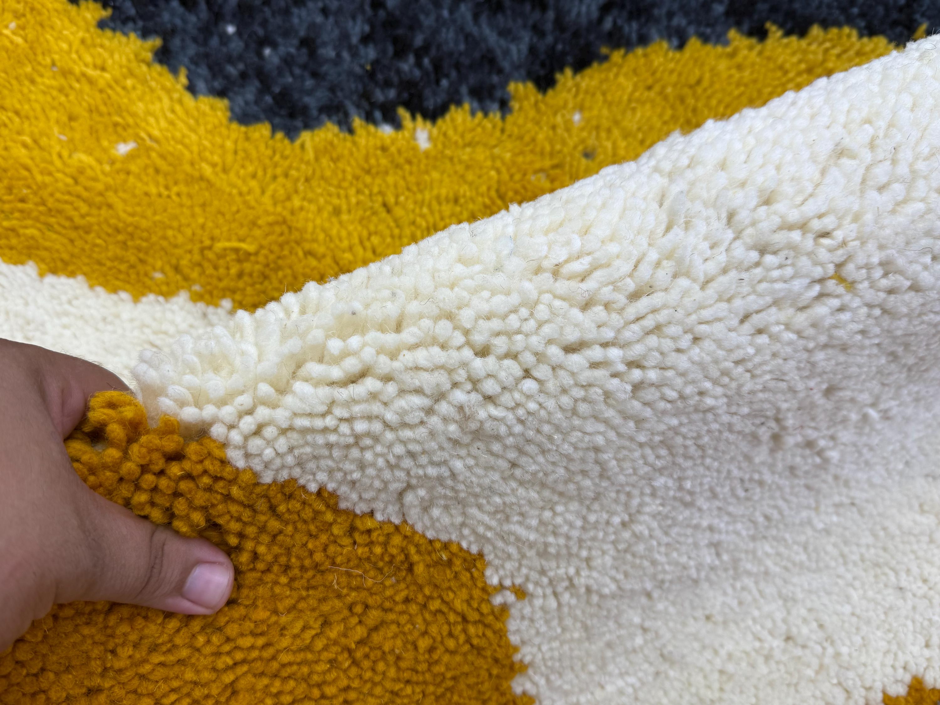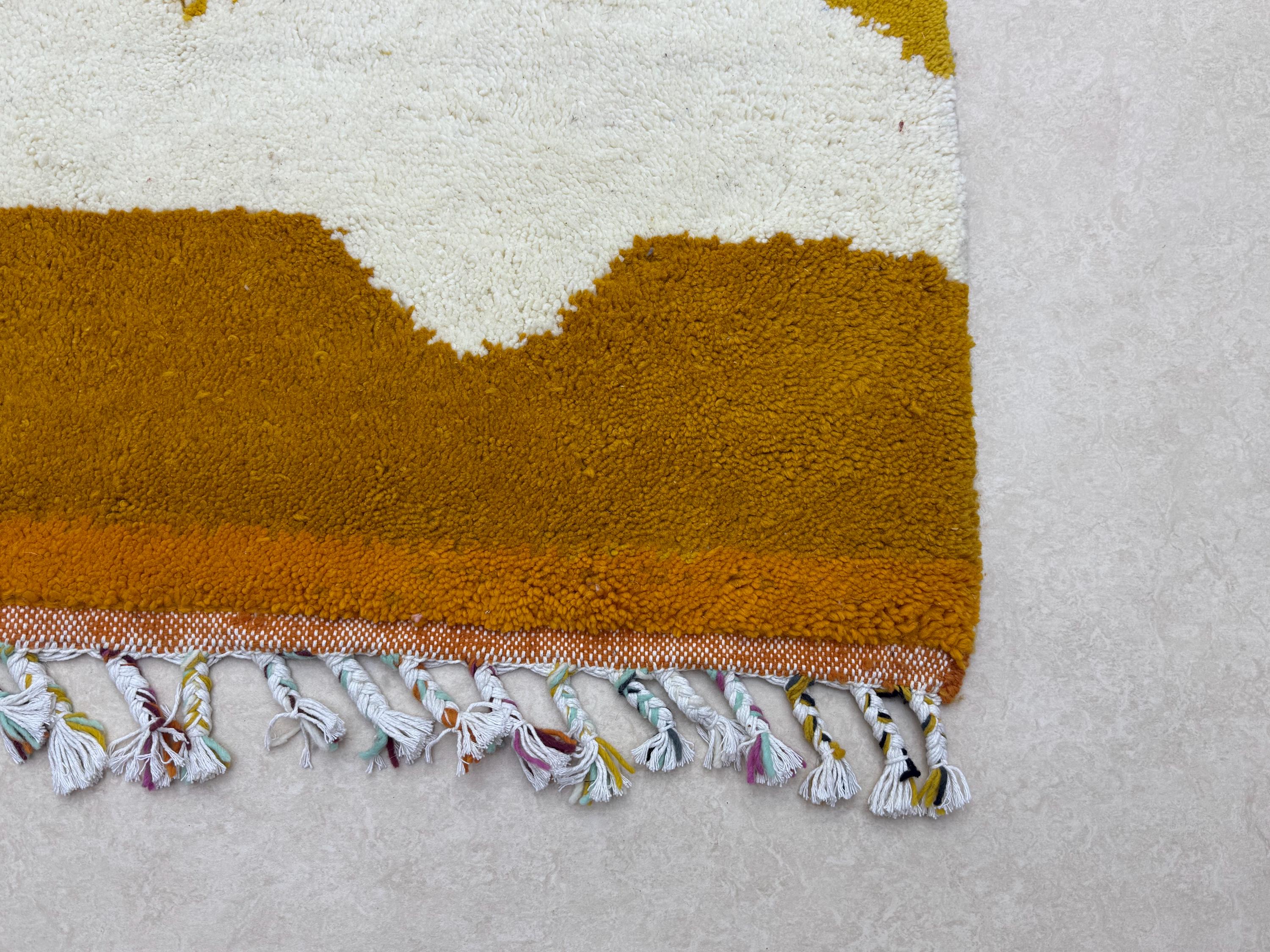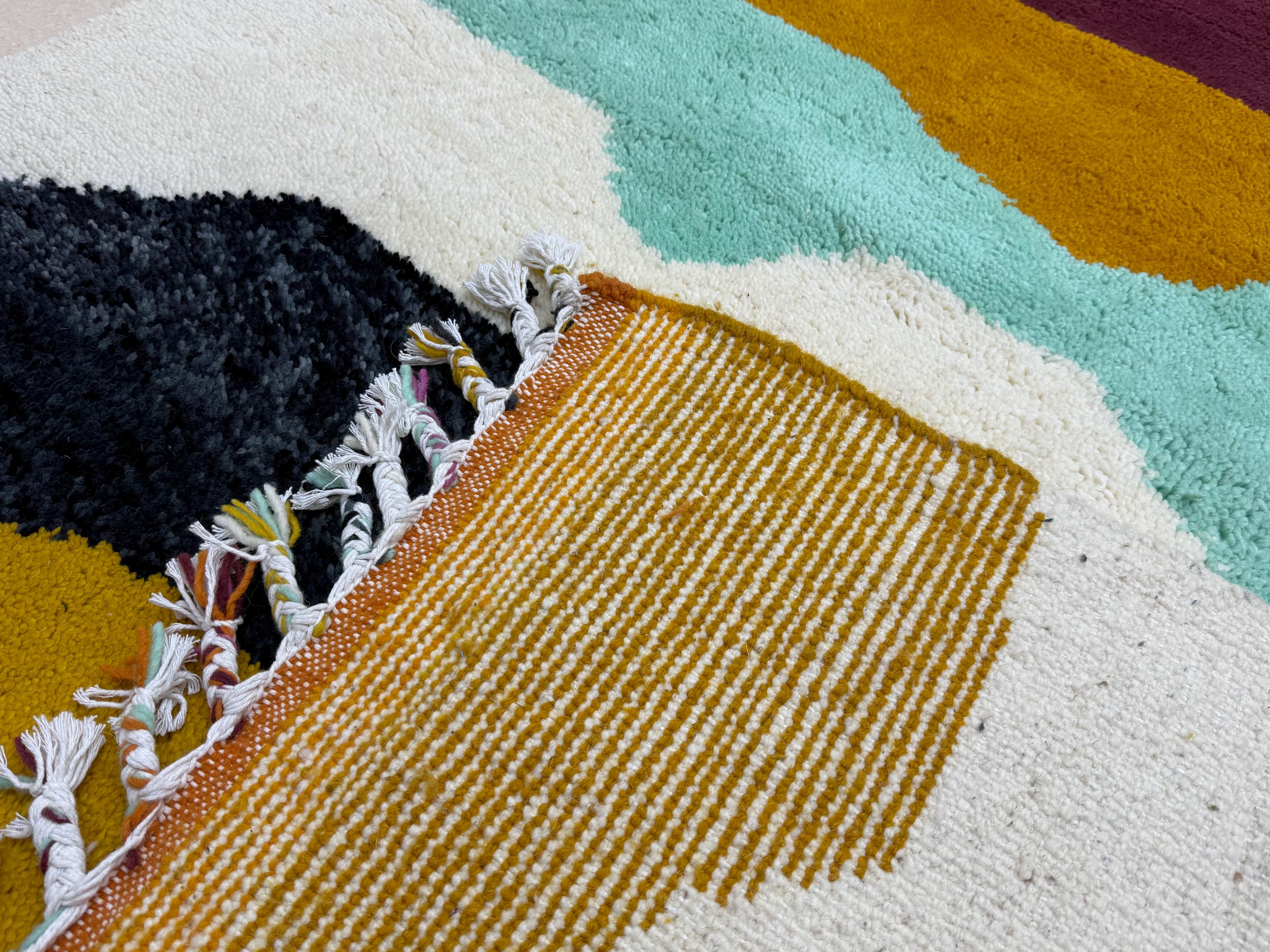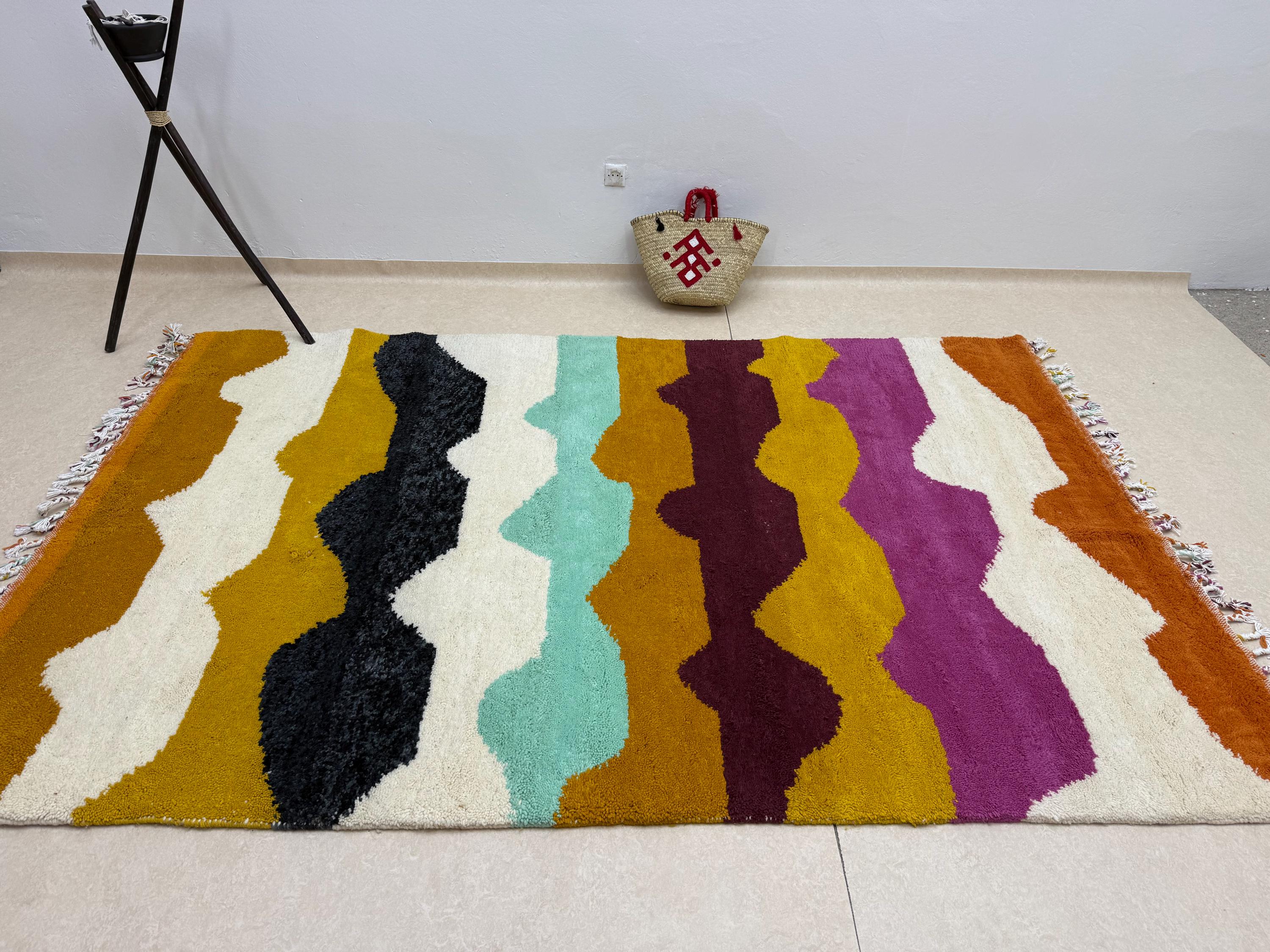 Bring a touch of Moroccan beauty into your home with this fabulous Beni Ourain rug. Handcrafted from shaggy, high-quality wool, this custom size Berber rug features a stunning multicolor abstract design, making it the perfect addition to elevate your space. Add a unique flair to your decor with this one-of-a-kind piece!