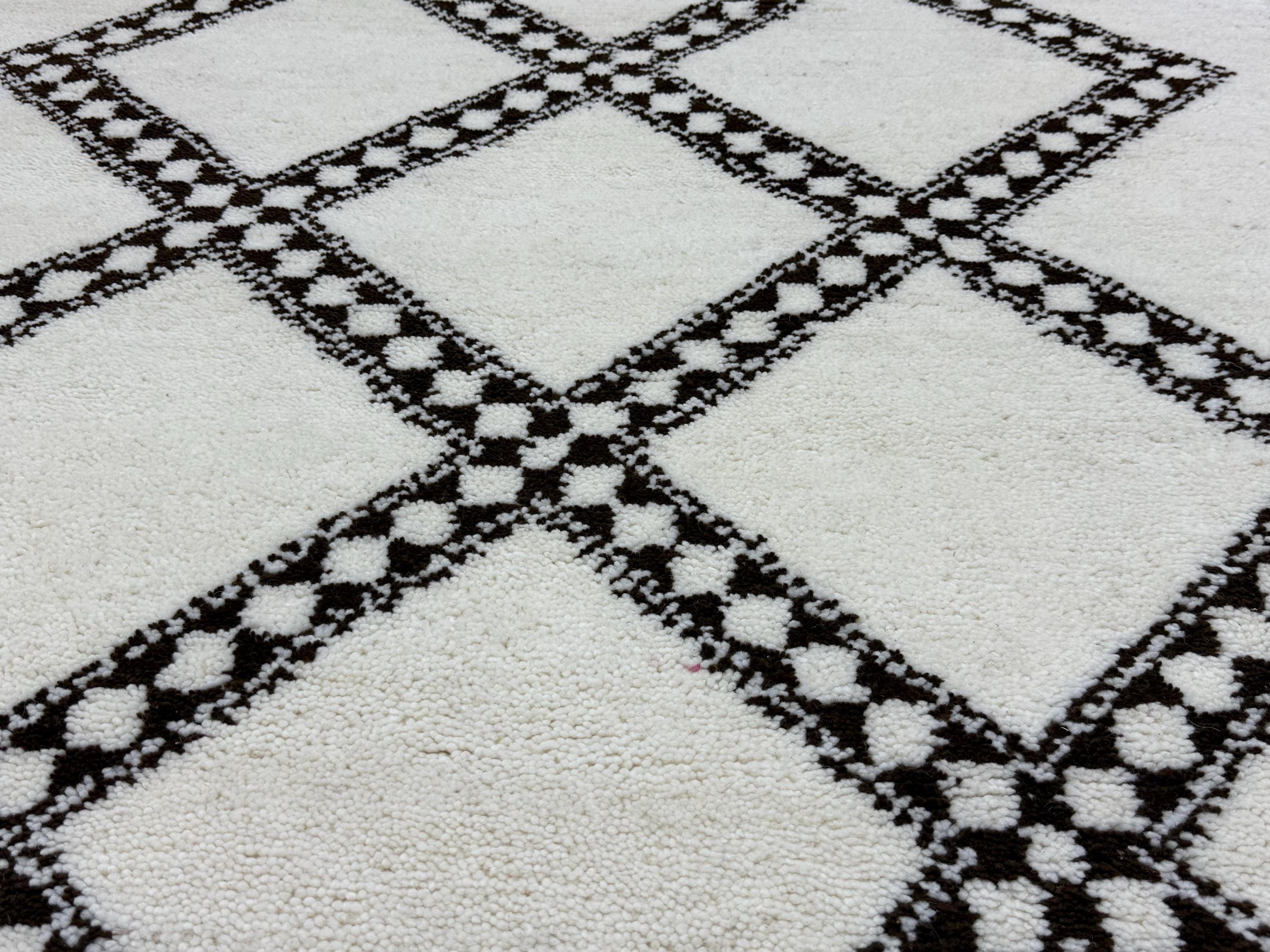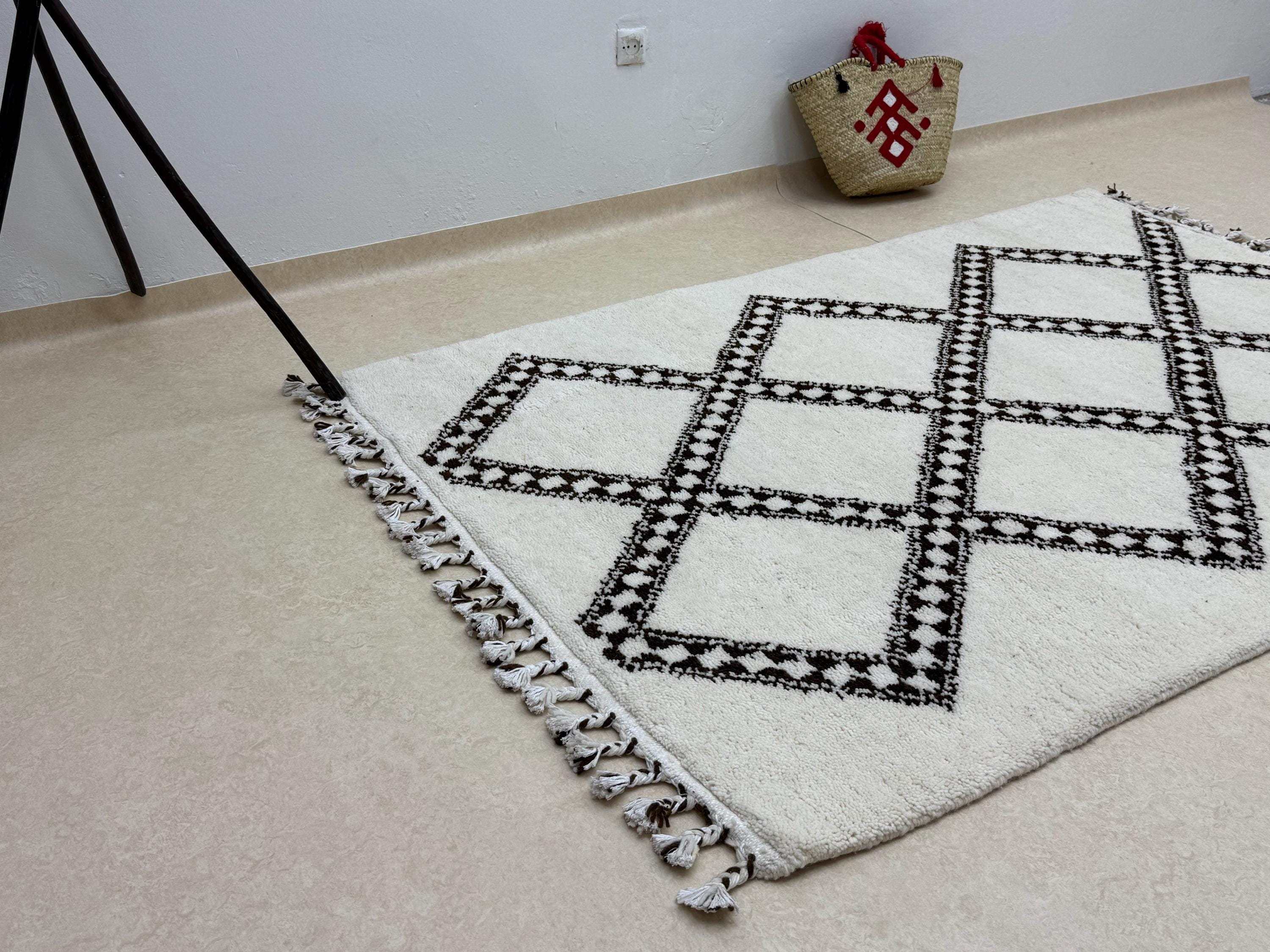Add a touch of warmth and style to your space with this cozy wool rug. This modern Beni Ourain rug features a unique brown and white Moroccan design, handwoven by Berber artisans. The geometric custom design makes it a standout piece, while its durable construction ensures it's perfect for high-traffic areas. Elevate your decor with this eye-catching area rug today!