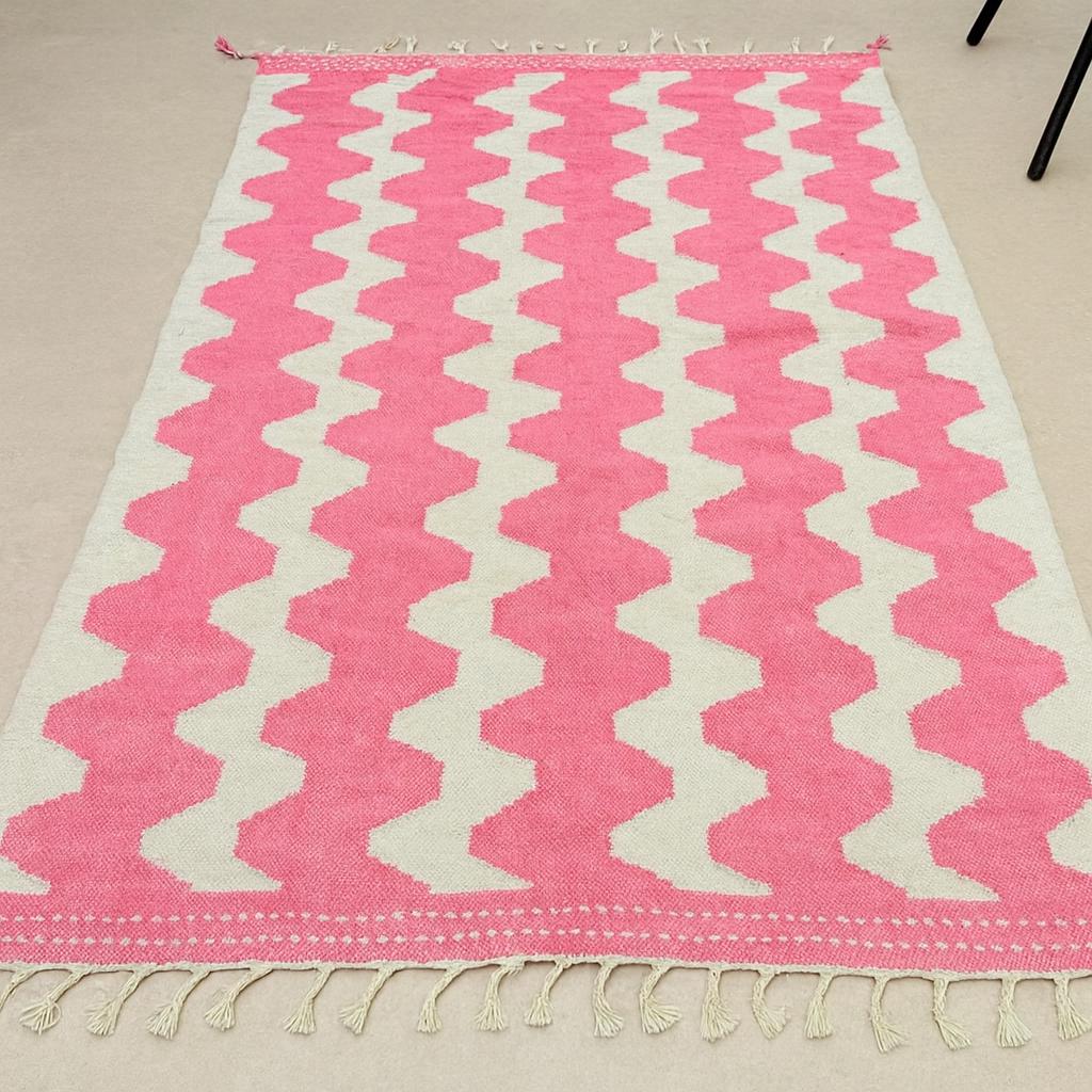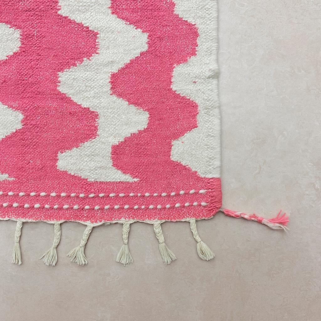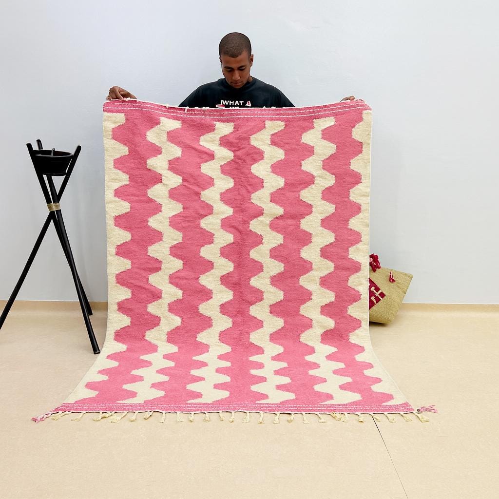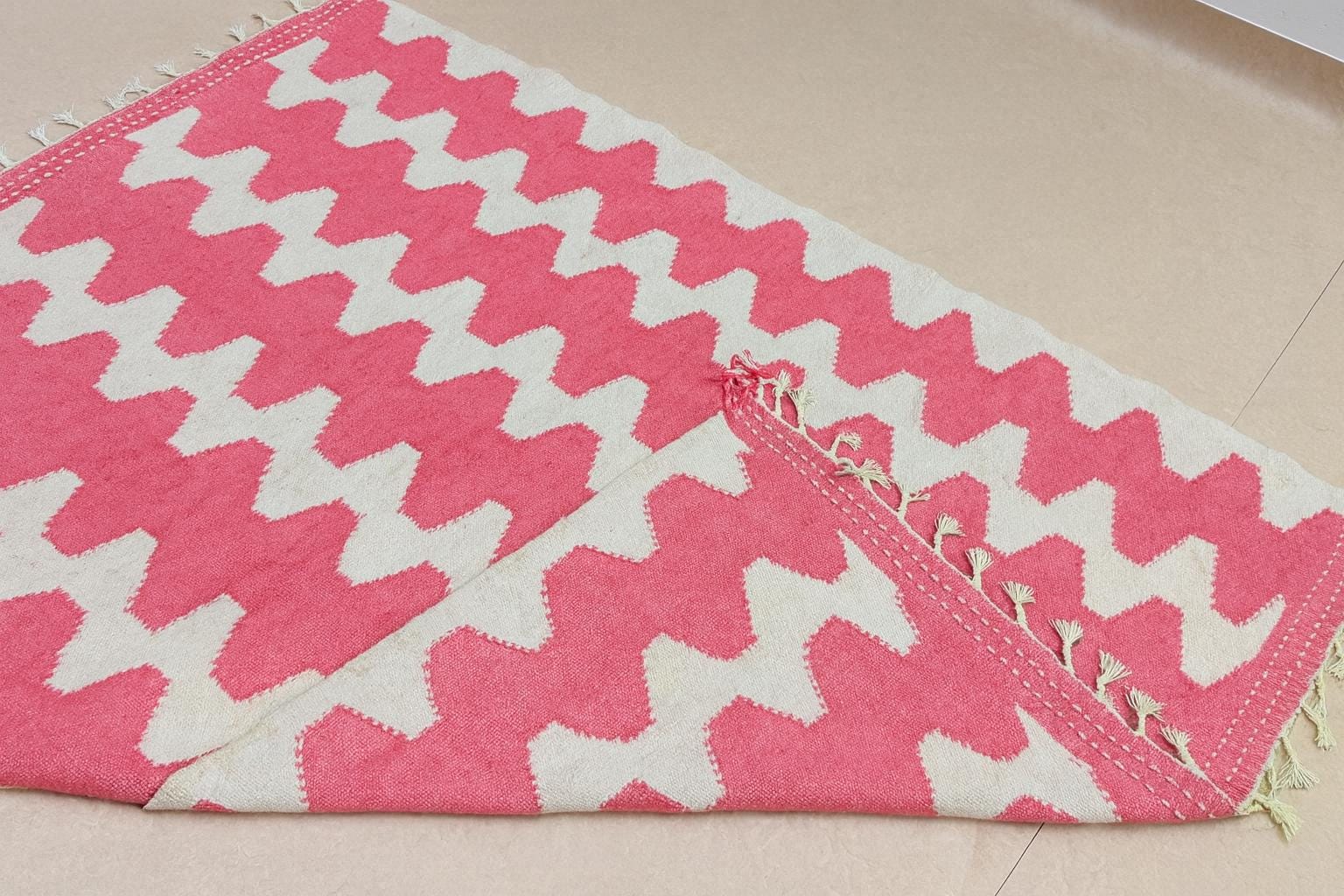 Elevate your space with our Flat Weave Rug featuring a stunning Kilim design in pink and white zigzag patterns. This exquisite Moroccan wool rug is a custom Zanafi handwoven masterpiece, perfect for adding a touch of elegance and warmth to your minimalist or boho home decor. Ideal for living rooms, bedrooms, or cozy nooks, this striped area rug combines style and comfort. Transform your interiors with this unique piece that showcases artisanal craftsmanship. Enjoy free shipping on your order!