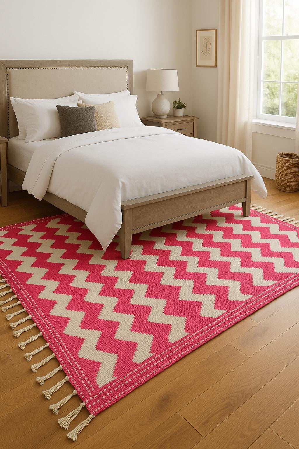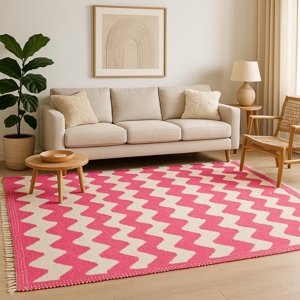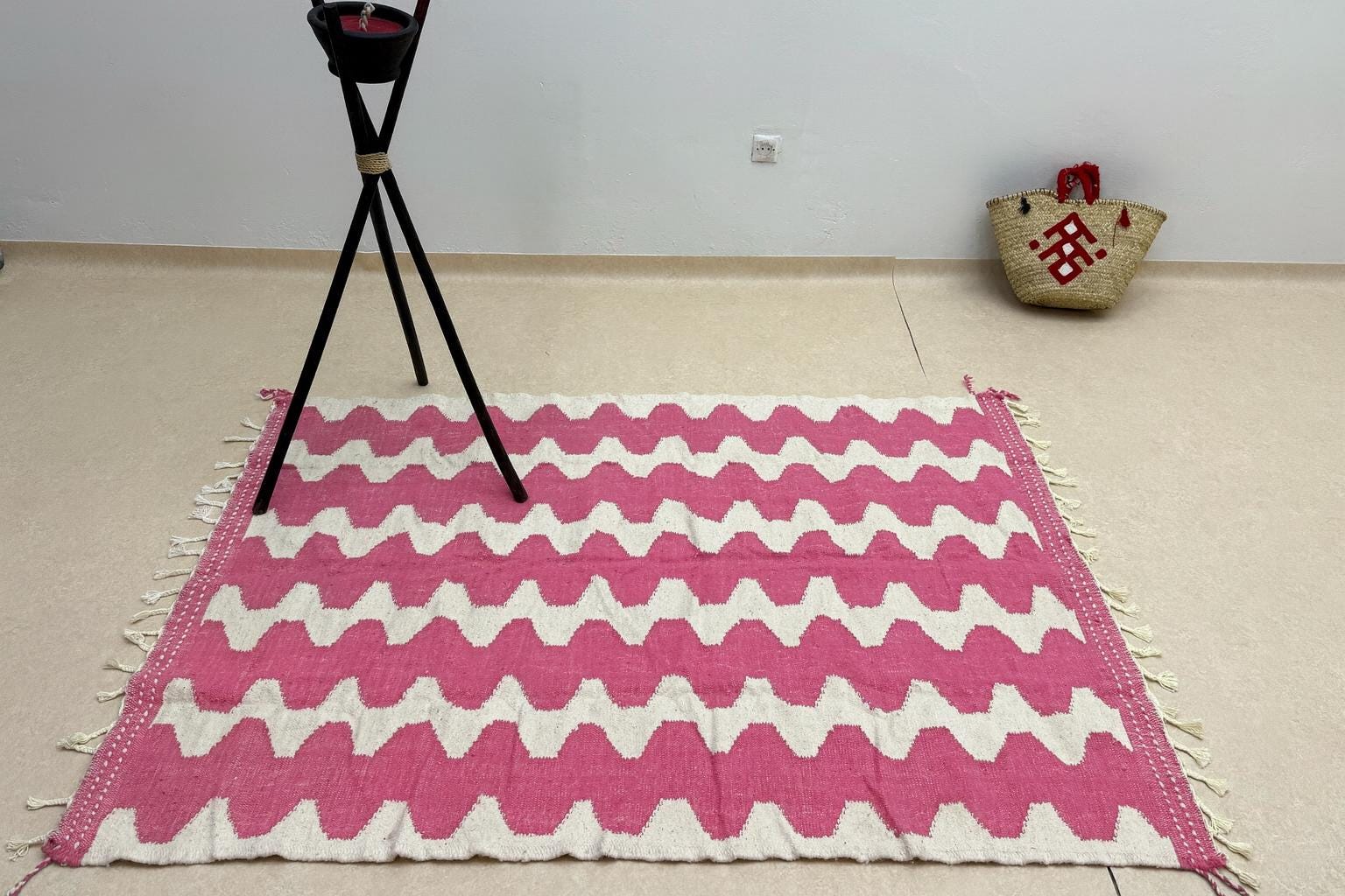 Elevate your space with our Flat Weave Rug featuring a stunning Kilim design in pink and white zigzag patterns. This exquisite Moroccan wool rug is a custom Zanafi handwoven masterpiece, perfect for adding a touch of elegance and warmth to your minimalist or boho home decor. Ideal for living rooms, bedrooms, or cozy nooks, this striped area rug combines style and comfort. Transform your interiors with this unique piece that showcases artisanal craftsmanship. Enjoy free shipping on your order!