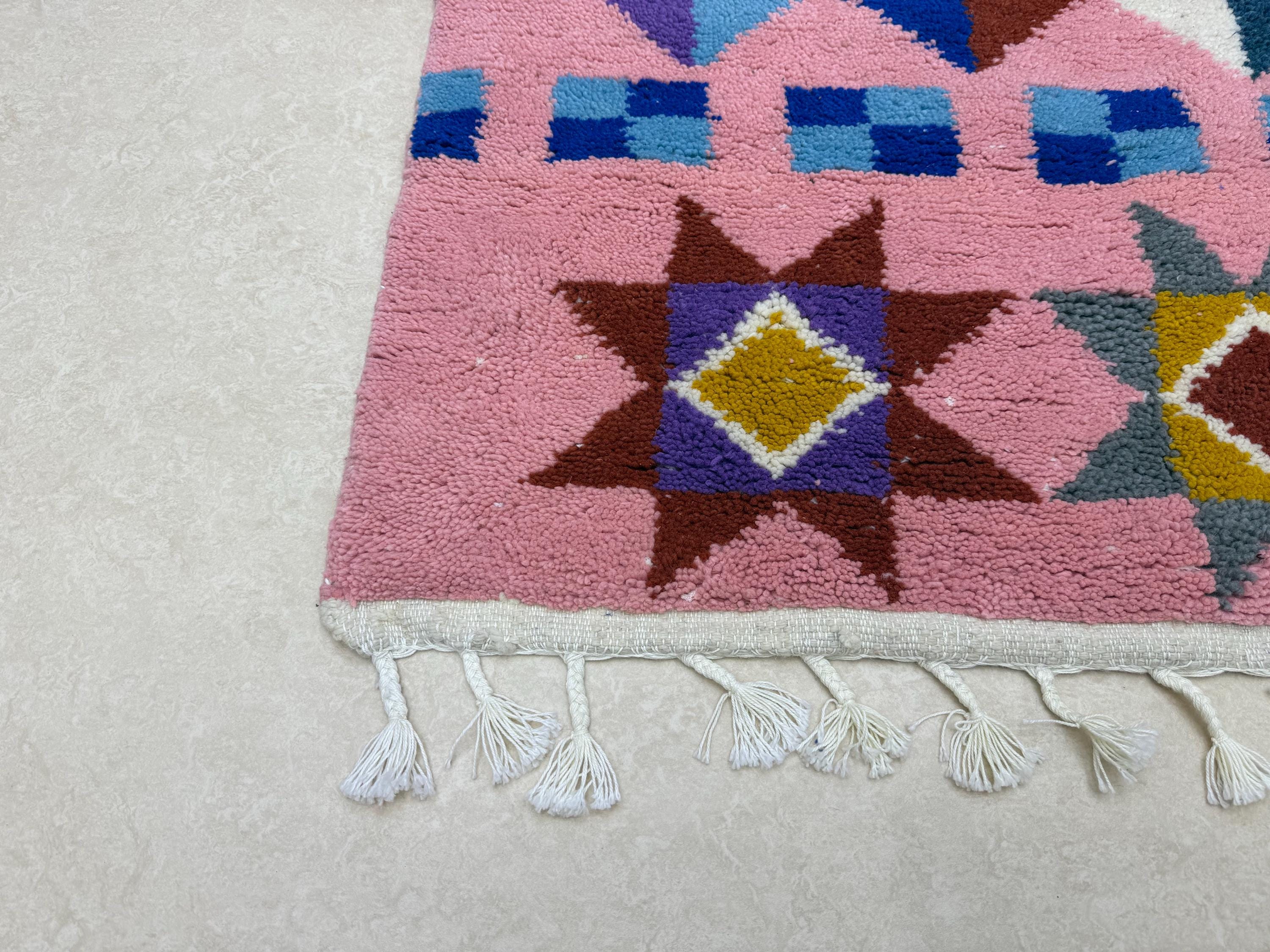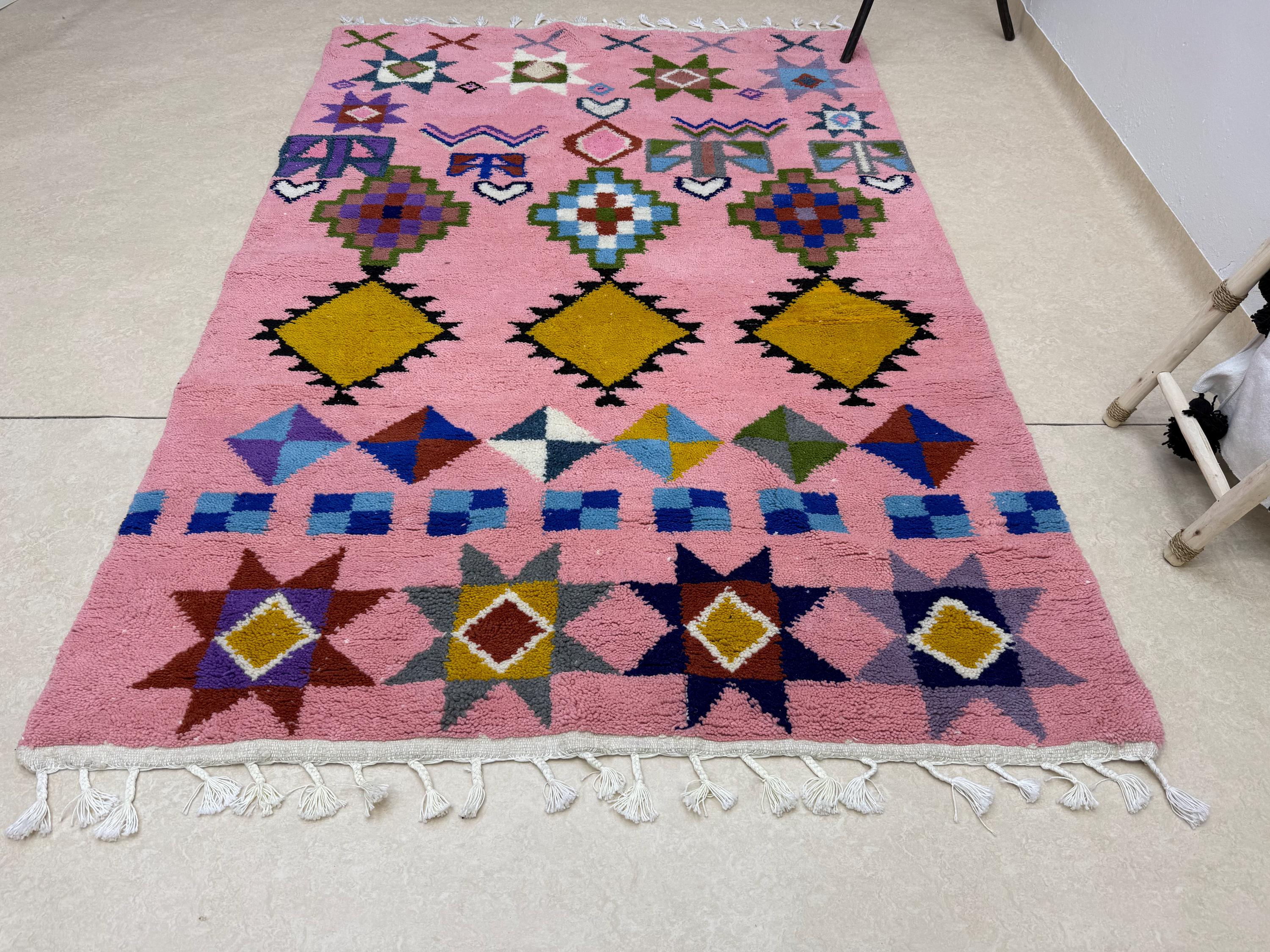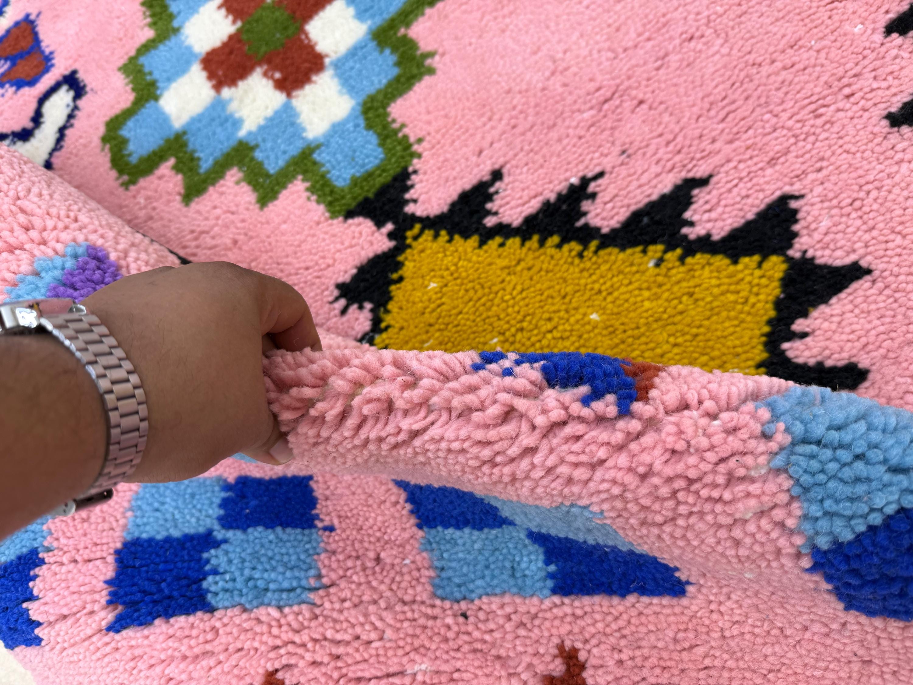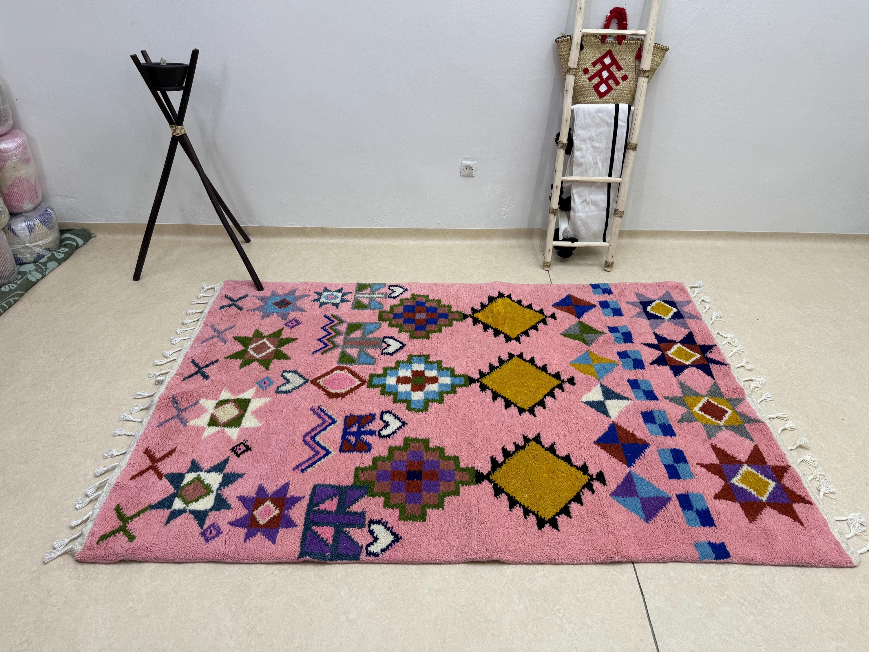 Enhance your living space with this Soft Beni Ourain Shag Rug, an Authentic Moroccan Carpet featuring a Pink Abstract Design. Handmade with love, this Bohemian Area Rug adds a touch of warmth and style to your home. Crafted from Wool, this Handcrafted Living Room Rug is a cozy and elegant addition to any room.