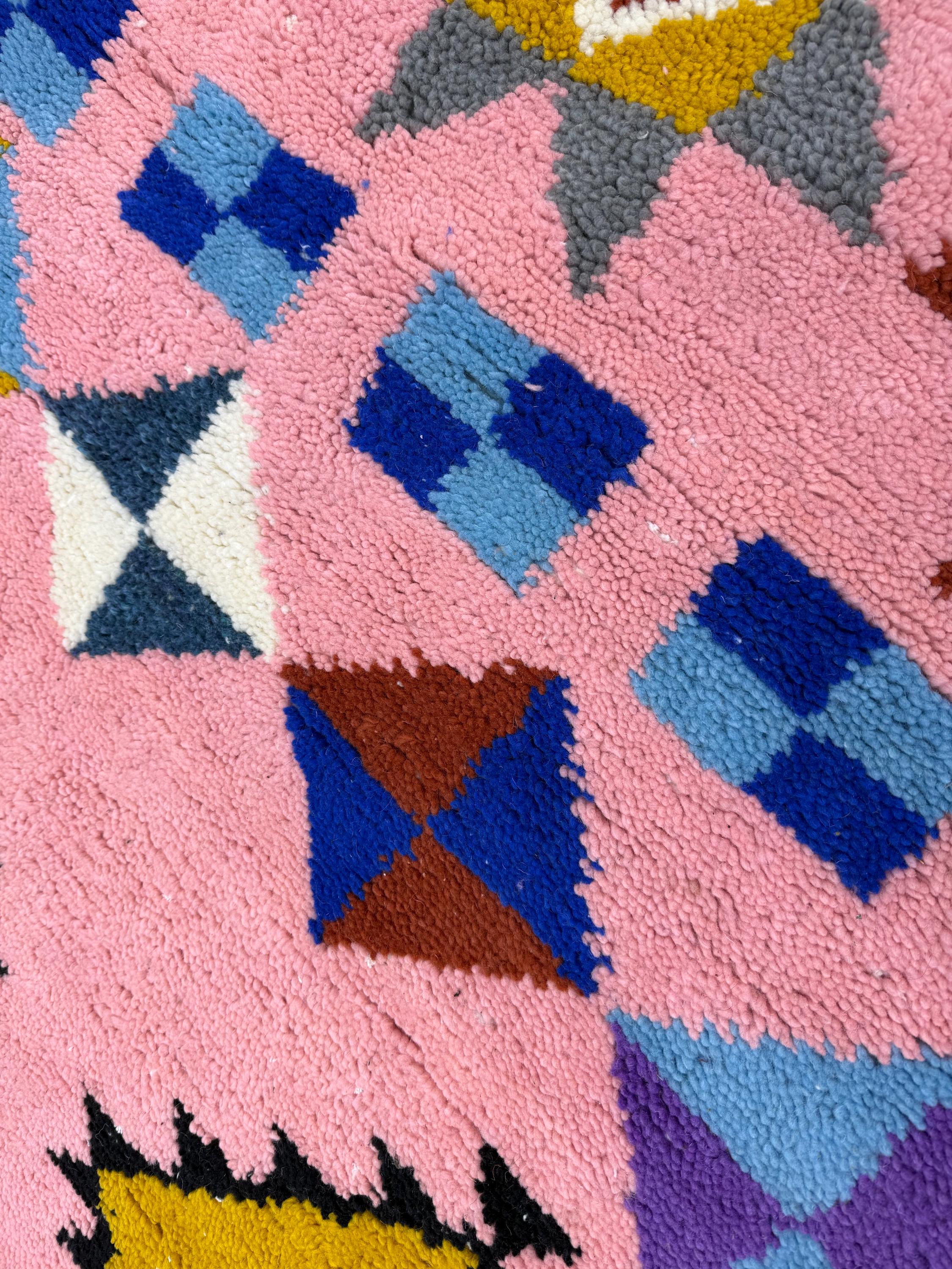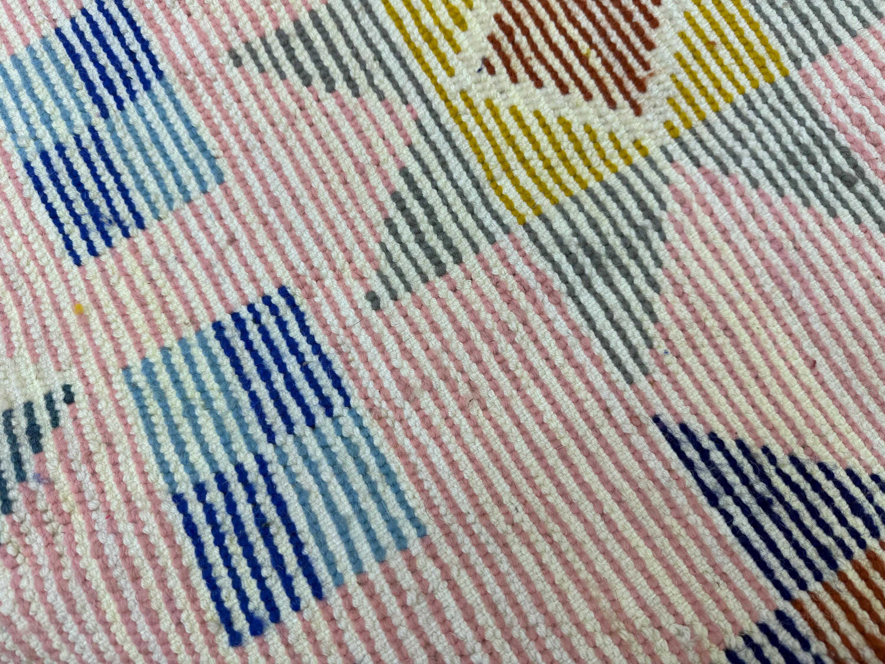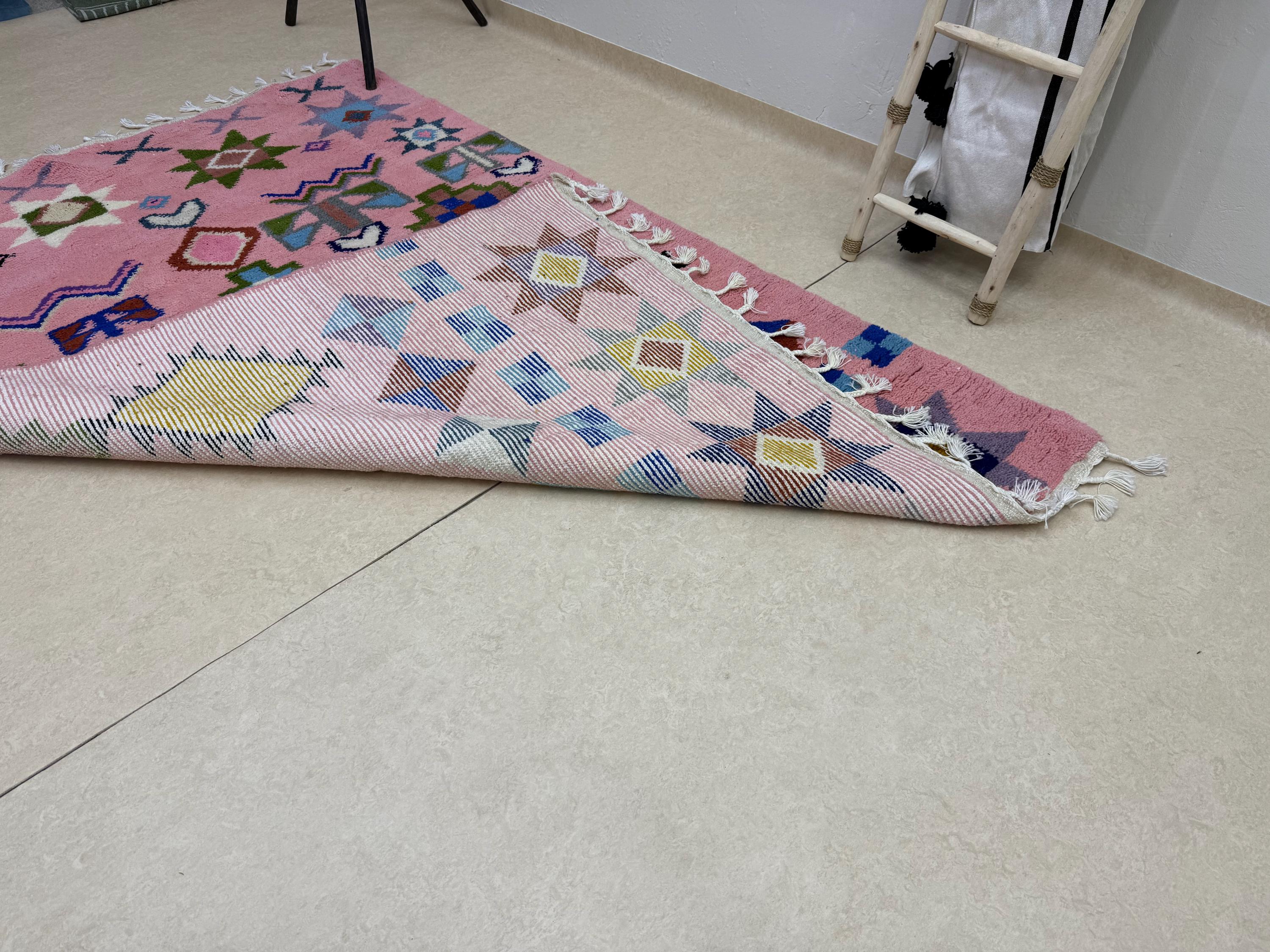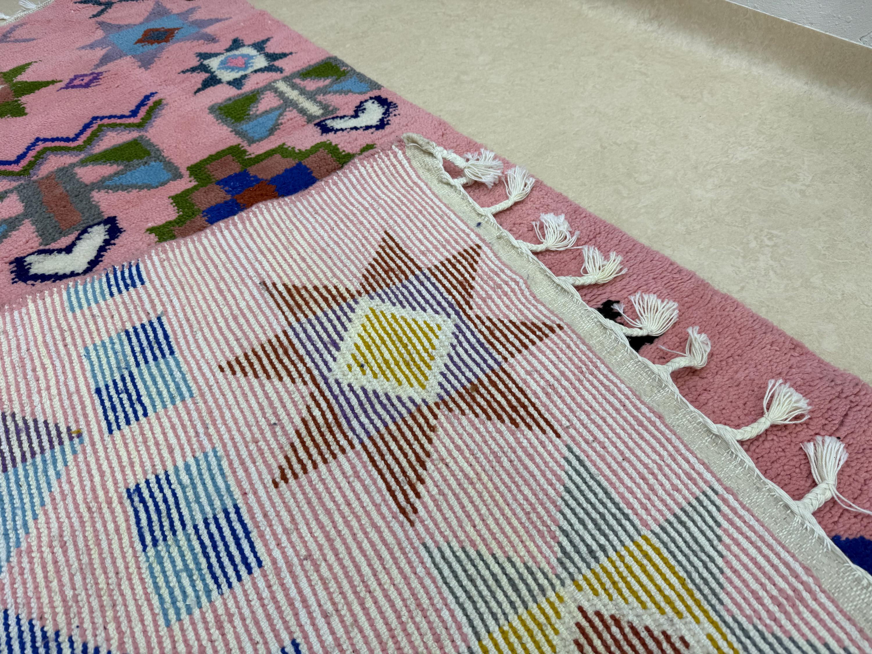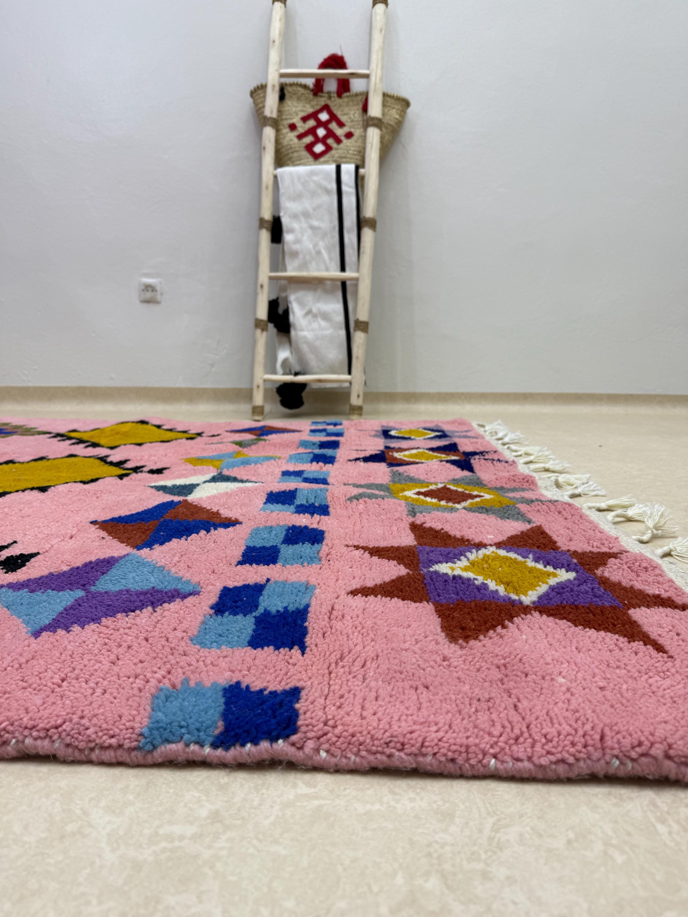 Enhance your living space with this Soft Beni Ourain Shag Rug, an Authentic Moroccan Carpet featuring a Pink Abstract Design. Handmade with love, this Bohemian Area Rug adds a touch of warmth and style to your home. Crafted from Wool, this Handcrafted Living Room Rug is a cozy and elegant addition to any room.