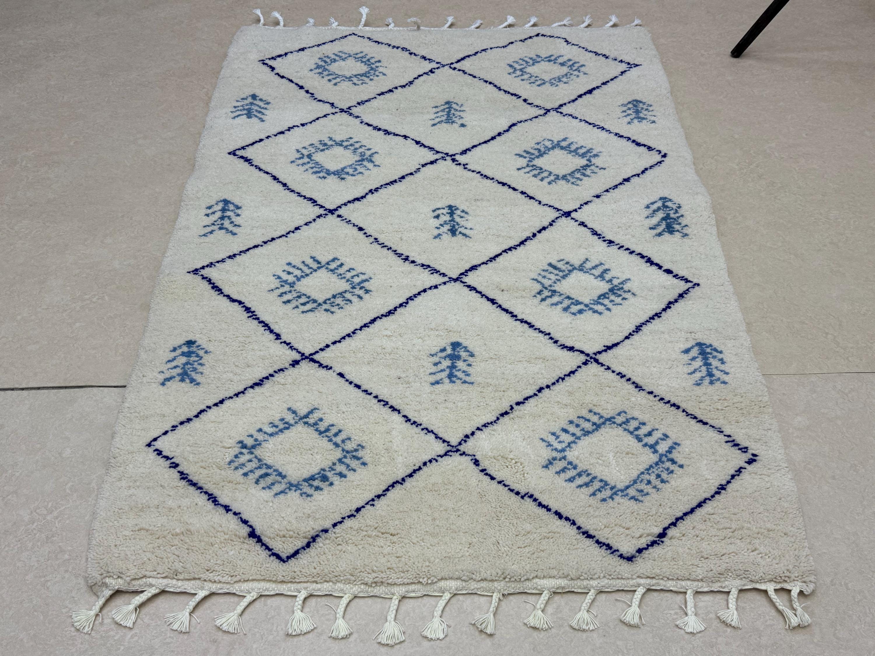 Enhance your living space with this exquisite 6.3x4.3FT Soft Beni Ourain Shag Rug. Handcrafted from high-quality wool in a lovely blue geometric design, this Moroccan rug adds a touch of bohemian charm to any room. Elevate your decor with this cozy and stylish handmade area rug!