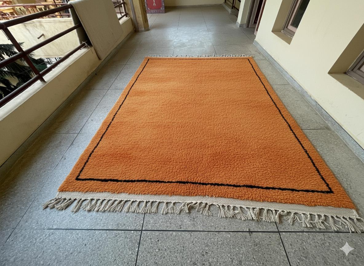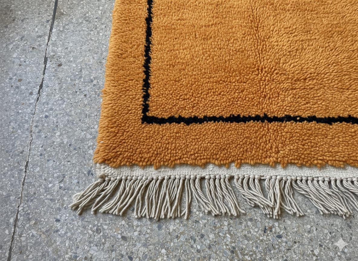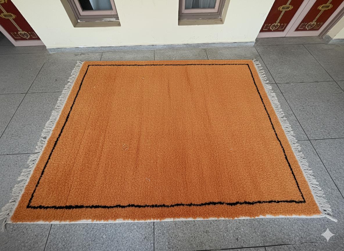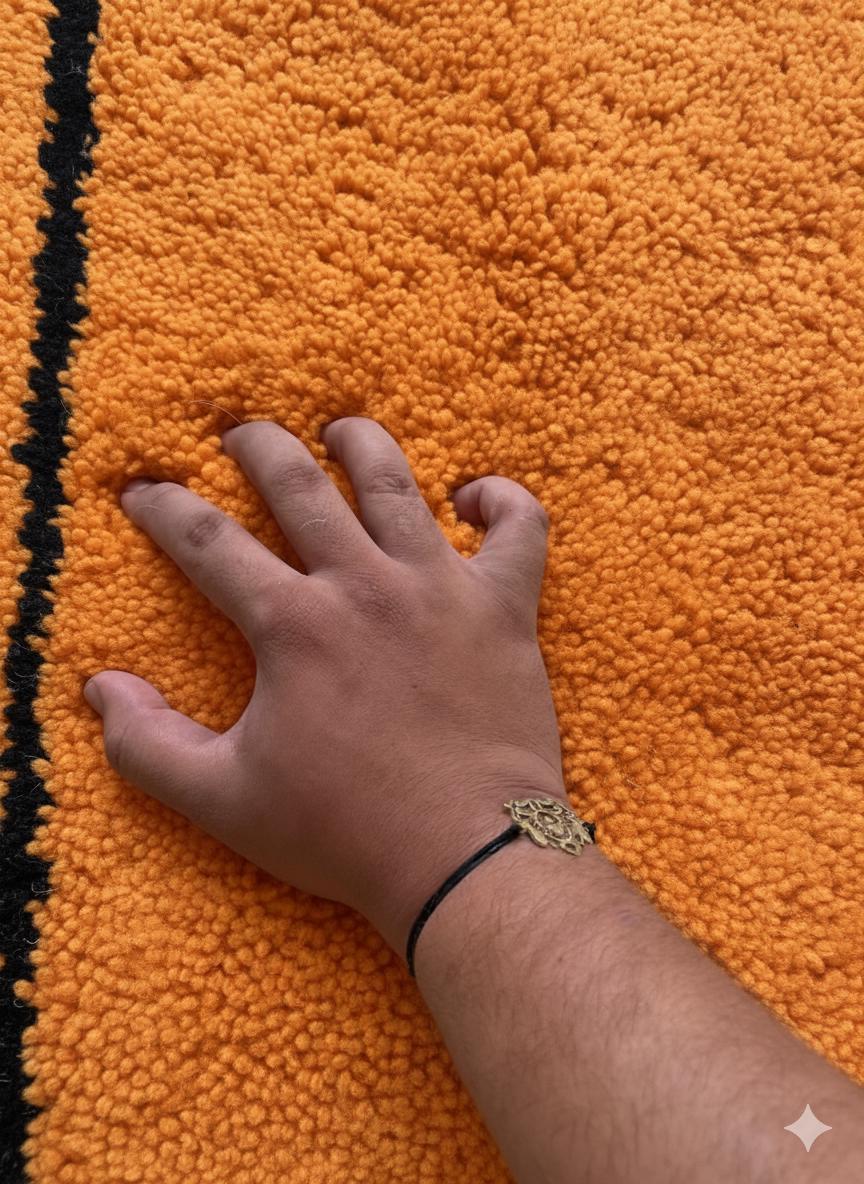 Transform your space with this elegant area rug, meticulously handwoven in the traditional Moroccan style. This bordered Berber carpet features striking orange and black patterns, embodying the beauty of a classic Beni Ourain rug. Perfect for adding warmth to any room, our custom size wool rug will complement your Scandinavian decor beautifully. Elevate your home aesthetics with this unique piece that merges functionality with artisan craftsmanship. Experience luxury and comfort underfoot!