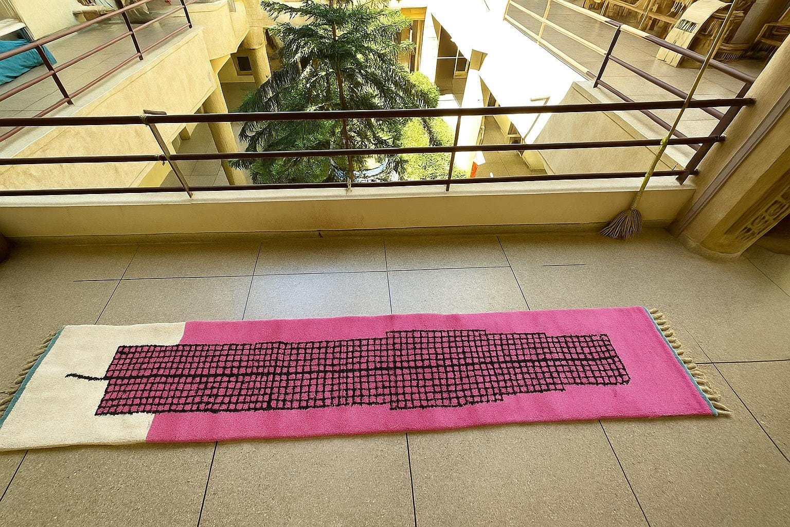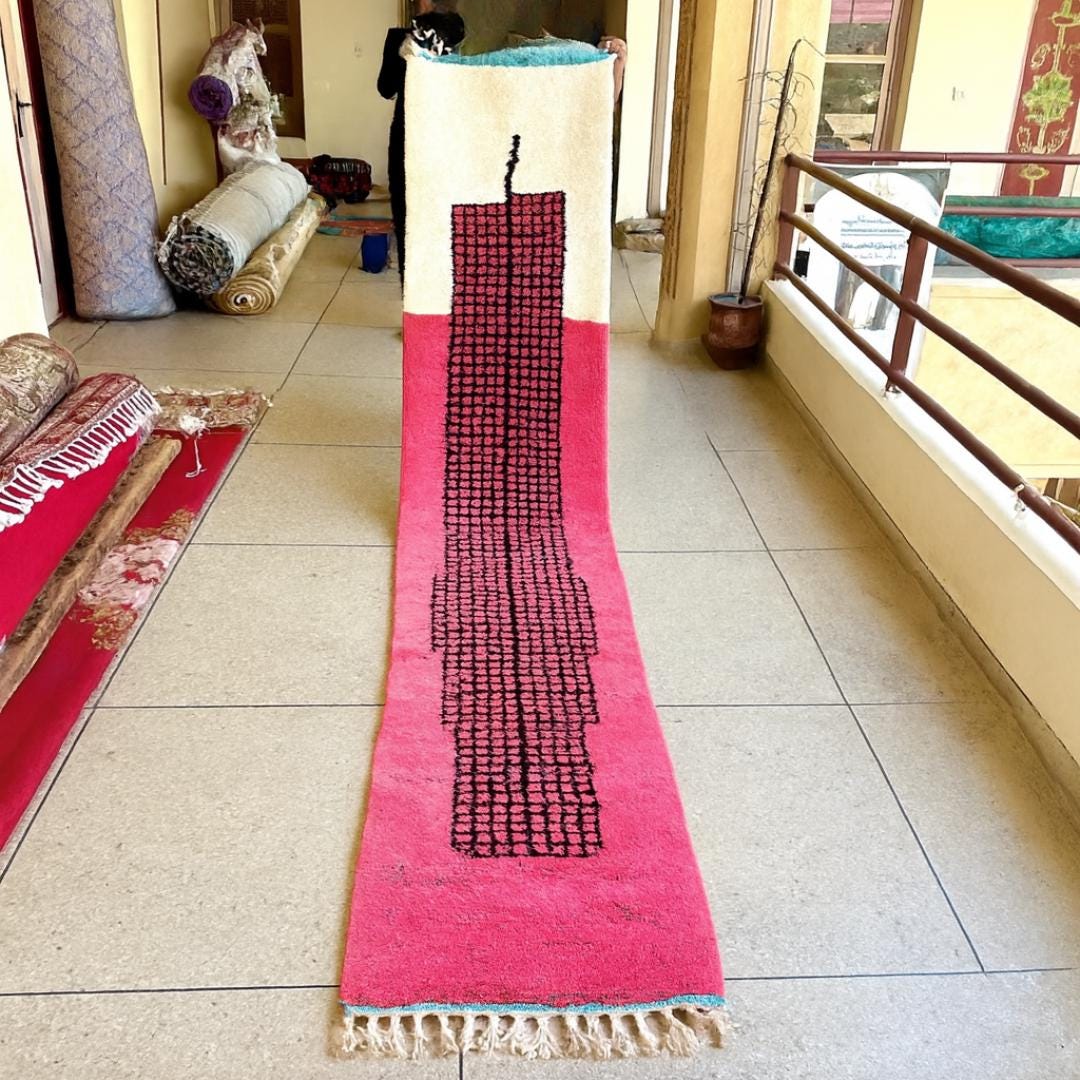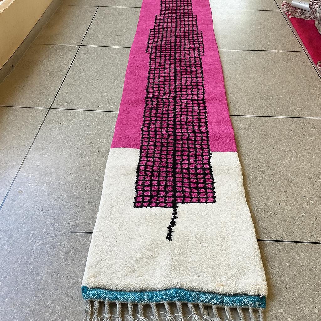 Add a pop of color and style to your hallway or entryway with this custom handwoven Moroccan runner rug. The vibrant Pink and white abstract design will add a boho chic touch to your space. Made from high-quality Berber wool, this unique runner is perfect for adding warmth and texture to any area. Make a statement with this one-of-a-kind piece!