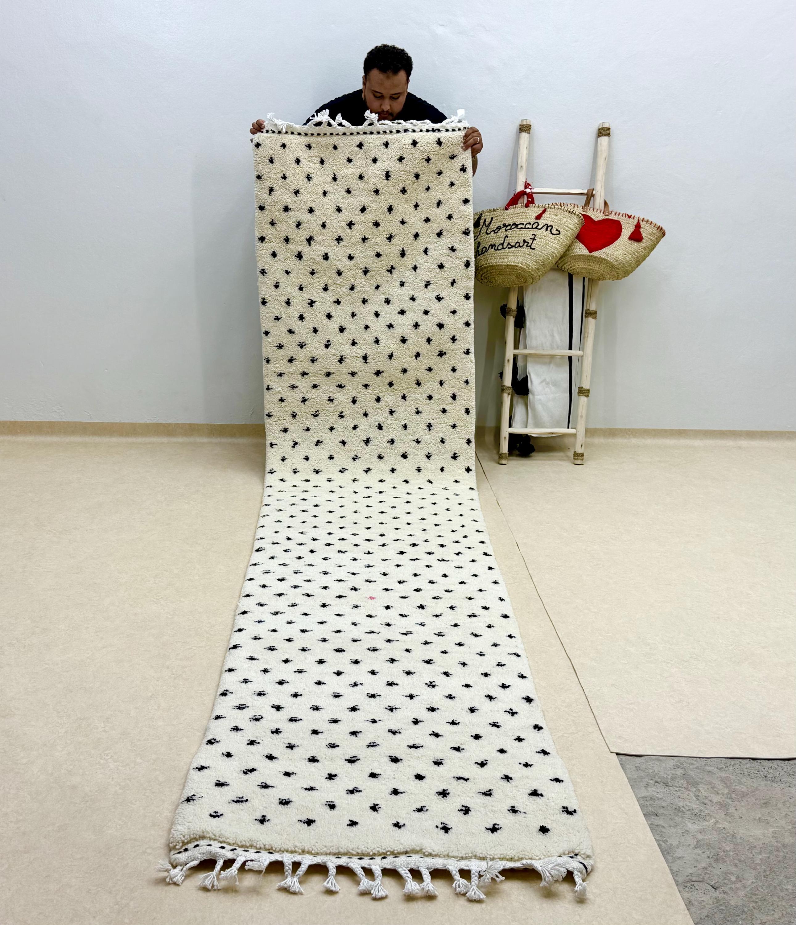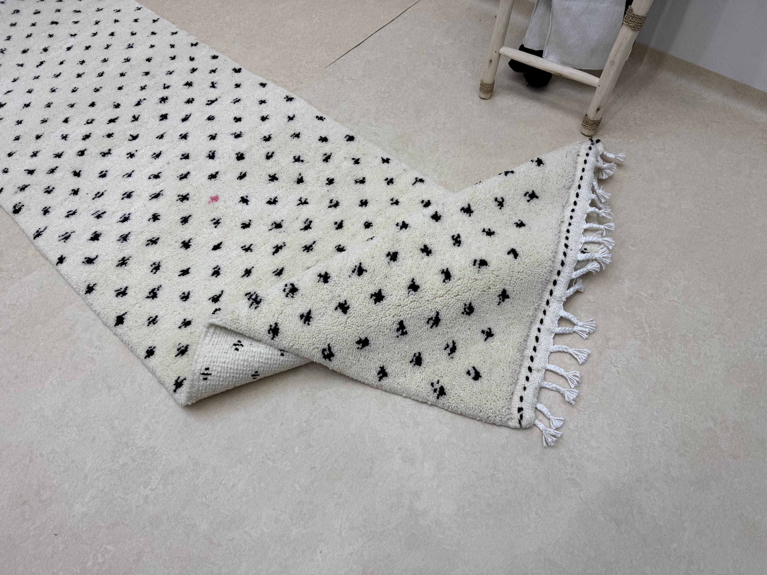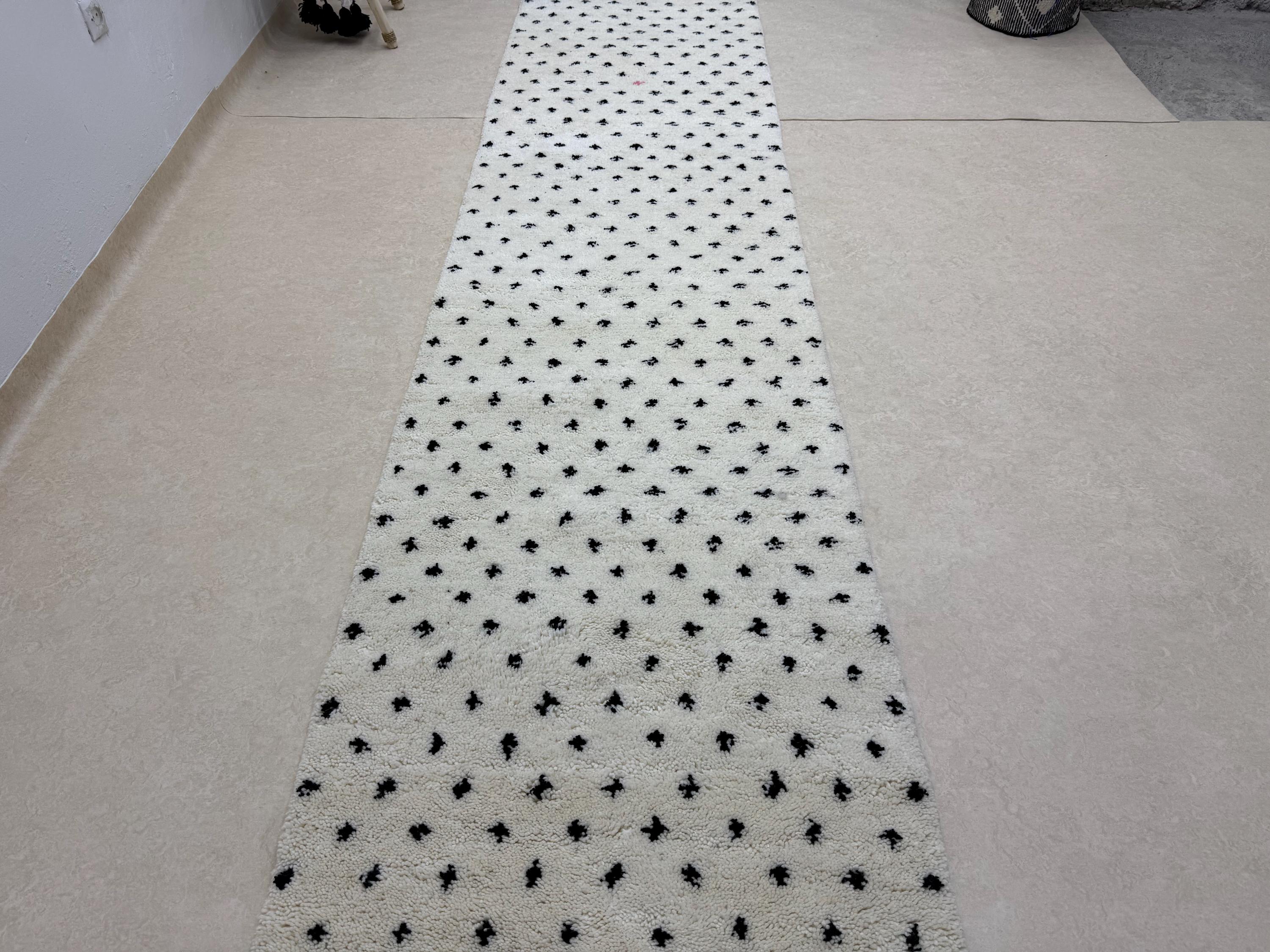 Transform your space with our Soft Hallway Runner, a stunning addition to any home. This Custom Handmade Beni Ourain Runner Rug showcases the beauty of traditional Moroccan craftsmanship. Made from luxurious wool, it features a unique dotted design in classic white and black tones, creating a striking contrast that enhances your hallway or living area. Perfect as a Berber Rug, it's not just a rug; it's a statement piece that adds warmth and elegance to your decor. Elevate your home today!