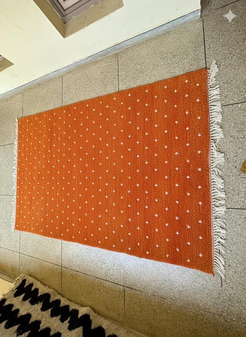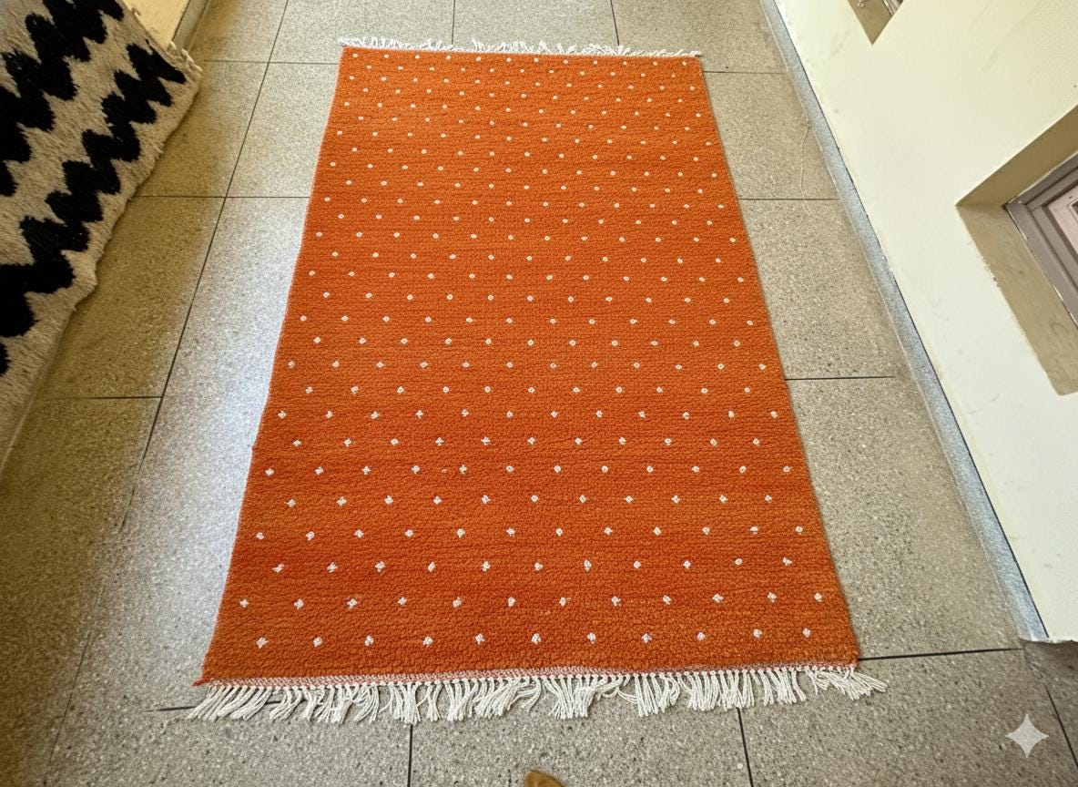 Transform your space with our stunning Pretty Berber Carpet—a Handmade Moroccan Rug that exudes elegance. Featuring a unique dotted Beni Ourain design in vibrant Orange and crisp white, this shaggy custom area rug adds a touch of luxury to any room. Perfect for living rooms, bedrooms, or as a statement piece in your home, it's an eye-catching alternative to traditional Home Depot rugs. Elevate your decor with this exquisite wool rug that combines style and comfort effortlessly!