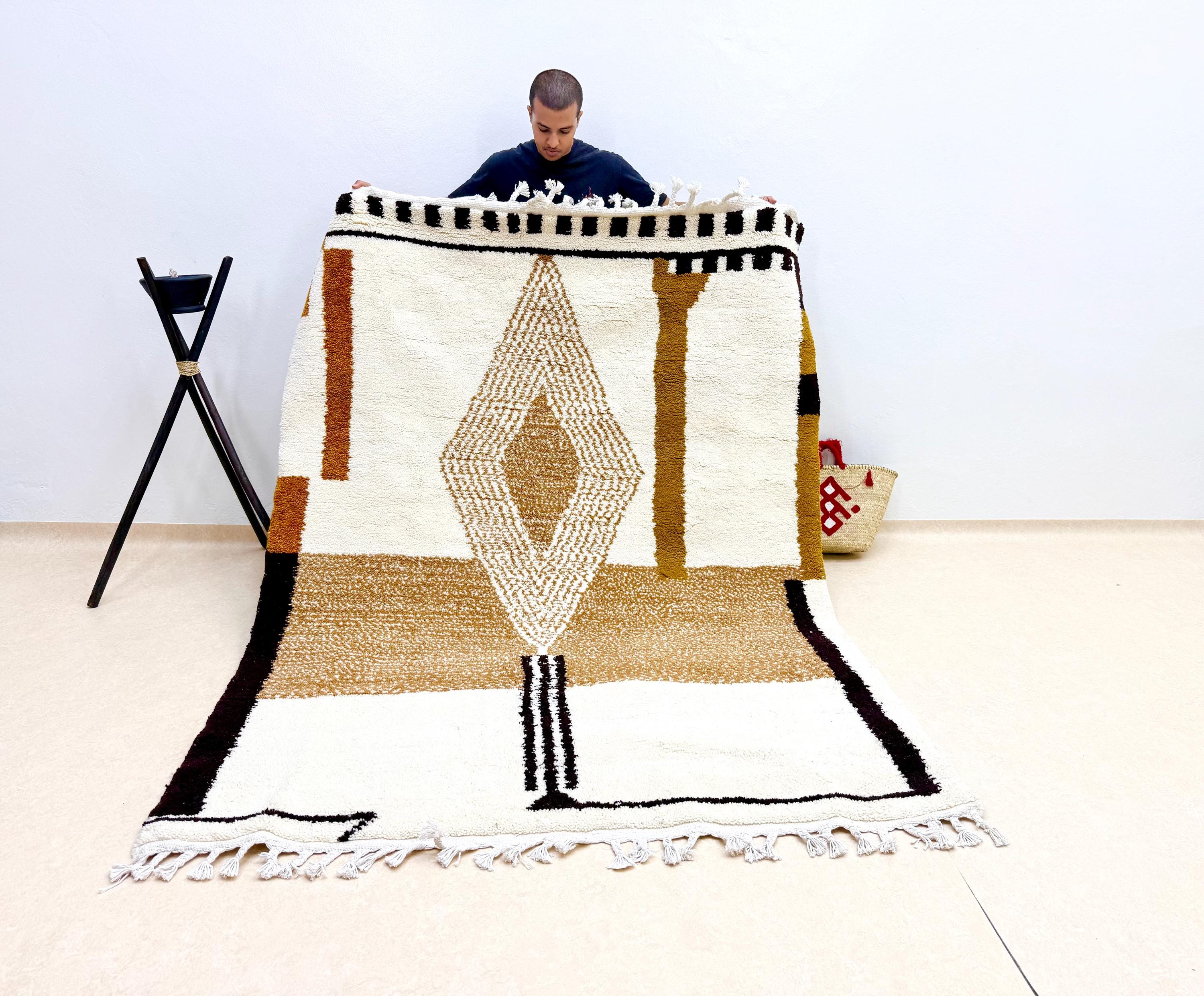 Transform your space with our stunning Berber Floor Rug, an artisan-woven Moroccan piece that combines tradition with modern design. This shaggy wool carpet features contemporary white and brown geometric lines, perfect for adding warmth and style to any room. Each custom-made Beni Ourain rug is unique, ensuring you have a one-of-a-kind accent in your home. Elevate your decor with this exquisite blend of comfort and craftsmanship! Ideal for living rooms, bedrooms, or any area in need of a cozy touch.