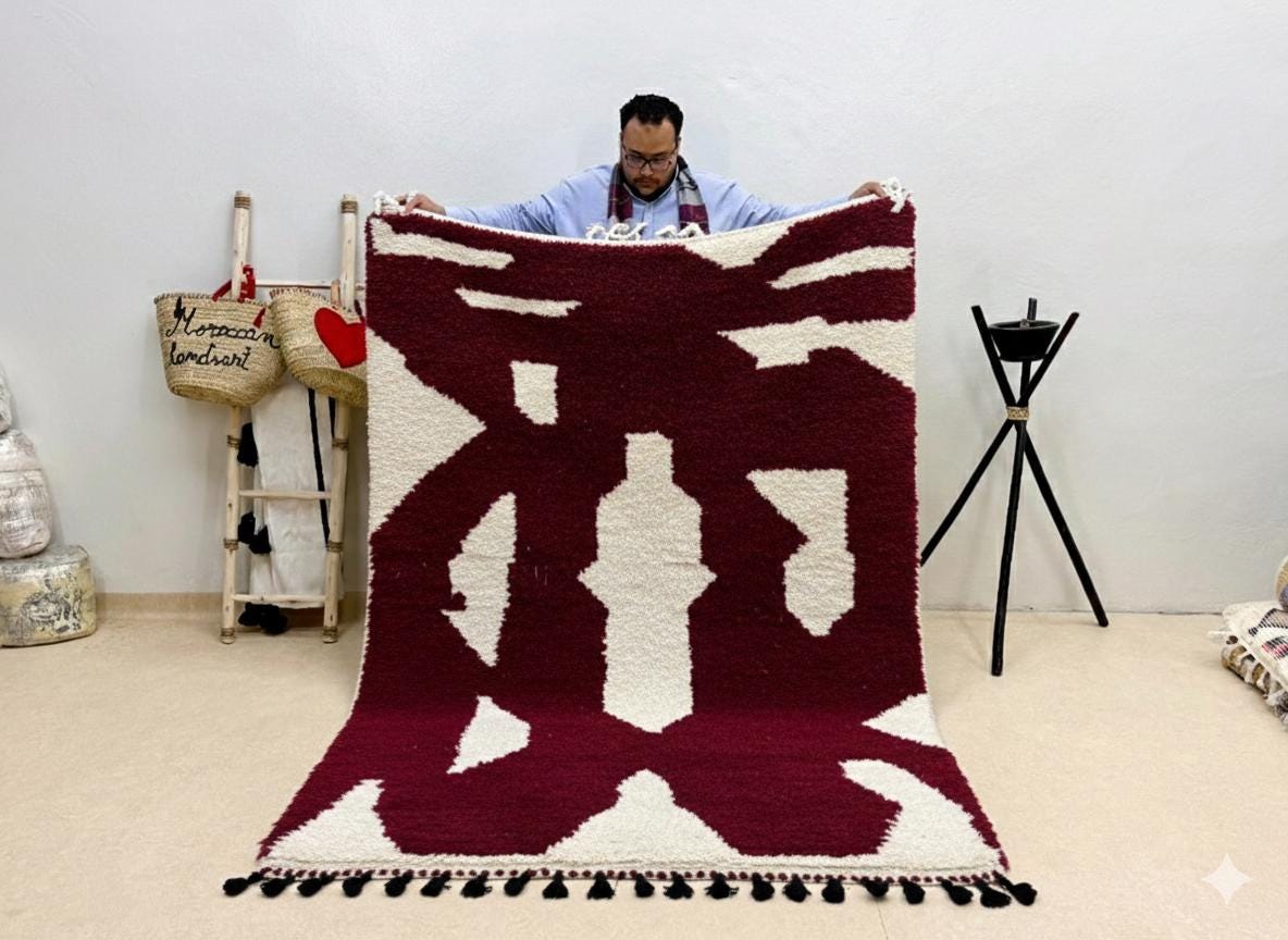 "Transform your home with a piece of Moroccan heritage that exudes both elegance and warmth 🌟. Whether placed under your sofa 🛋️, in your bedroom 🛏️, or even as a wall hanging 🖼️, these rugs invite a sense of history, style, and comfort 🧶✨ Explore our full collection of Beni Ourain, Azilal, and Boucherouite rugs for unique pieces that tell a story 📚💫.”