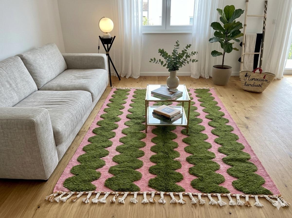Elevate your space with our exquisite BENI OURAIN RUG, featuring a stunning moss green and pink color palette. This Handmade Striped Wool Carpet adds a touch of contemporary charm to your living room, offering both warmth and style. Crafted with traditional Moroccan Berber techniques, each rug is a unique masterpiece that complements any decor. Perfect for brightening up your home, this versatile piece is ideal for modern interiors. Transform your living room into a cozy retreat with this beautiful floor rug!
