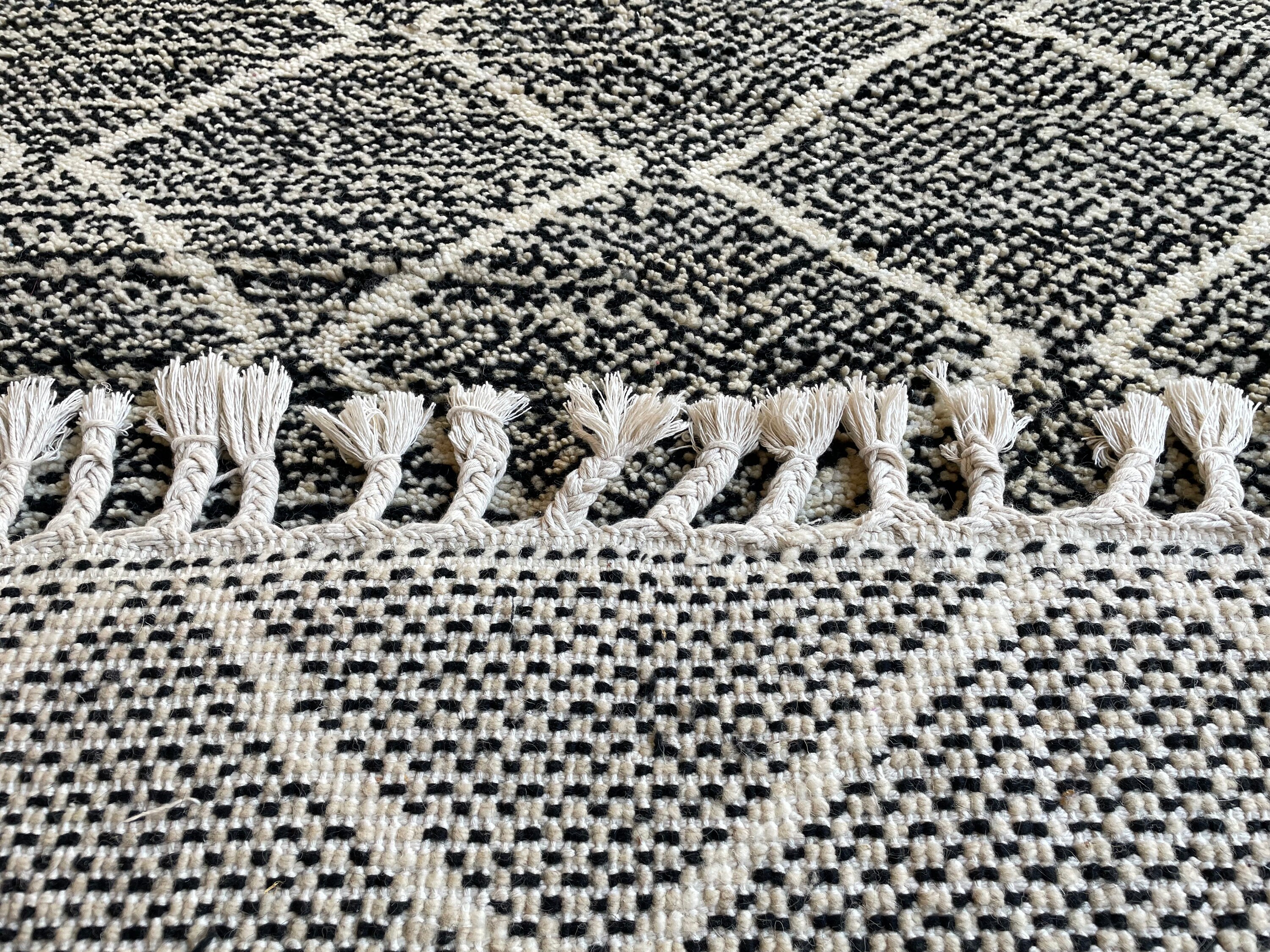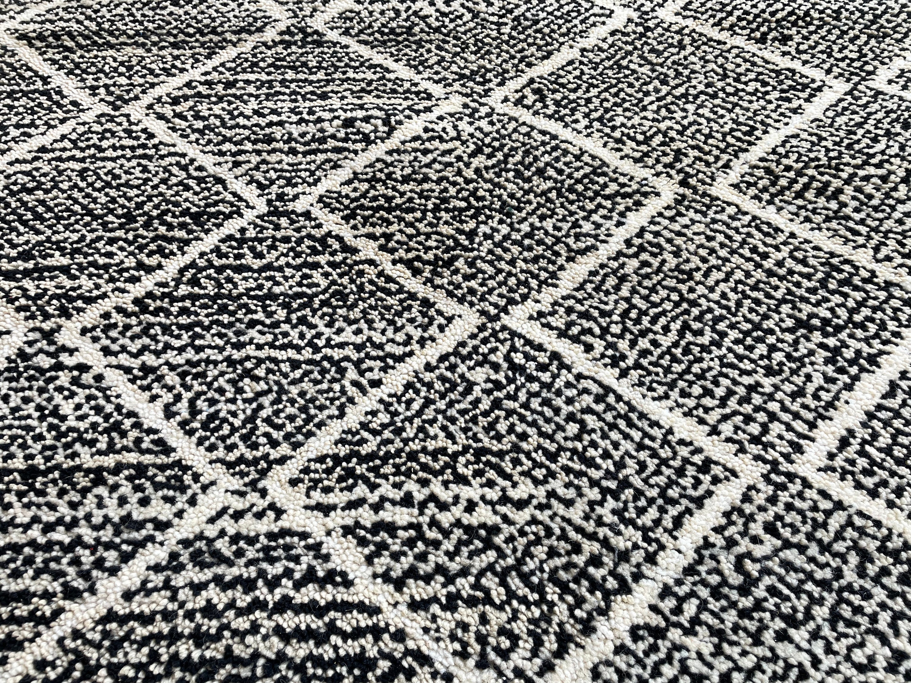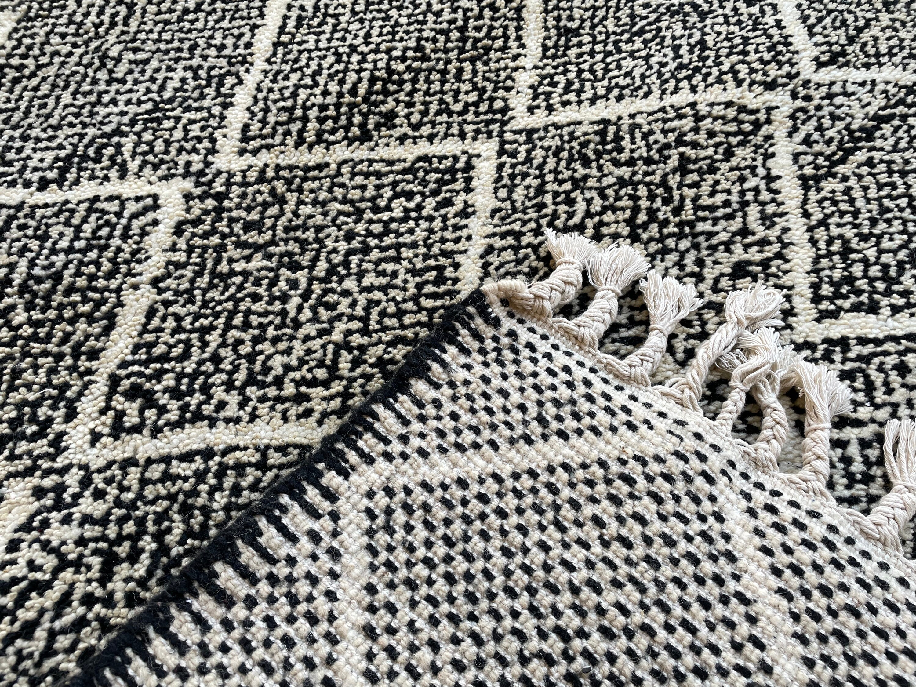 Elevate your space with the timeless elegance of this Beni Ourain rug! Handwoven by skilled Berber artisans using premium sheep wool, this black and white geometric masterpiece adds warmth, texture, and authenticity to any living space. Its minimalist yet bold design complements bohemian, modern, and Scandinavian interiors. Whether for your living room, bedroom, or office, this handmade Moroccan rug is the perfect blend of tradition and contemporary style.